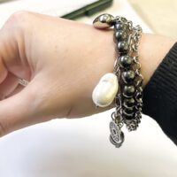 3000,00 ₽Двухрядный браслет на проволоке с памятью собран из жемчуг разных цветов и форм и горного хрусталя. Фурнитура премиум класса под золото. На запястье 16-17 см.