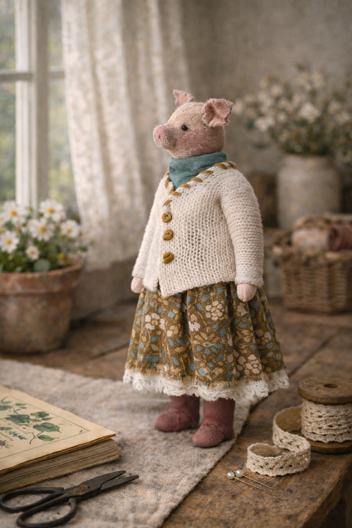Хрюша Майя — будто добрая соседка из старой скамеечки у окна. Она знает цену простым радостям: мягкому утреннему свету, тихому шороху книжных страниц и чашке тёплого чая. В ней нет лишнего блеска, зато есть настоящее тепло, забота и ощущение дома, где любят и ждут.