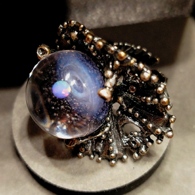 Вселенная выполнена в технике лемпворк (lampwork) из американских стекол в пламени горелки при 1200 С. И для прочности отожжен в муфельной печи. Очень прочный, не разобьётся. Шинка колечка с серебрением 999 высшей пробы. Шинка разькмная — подойдет на пальчик любого размера. Максимальный диаметр короны 50мм , косммошара 20мм