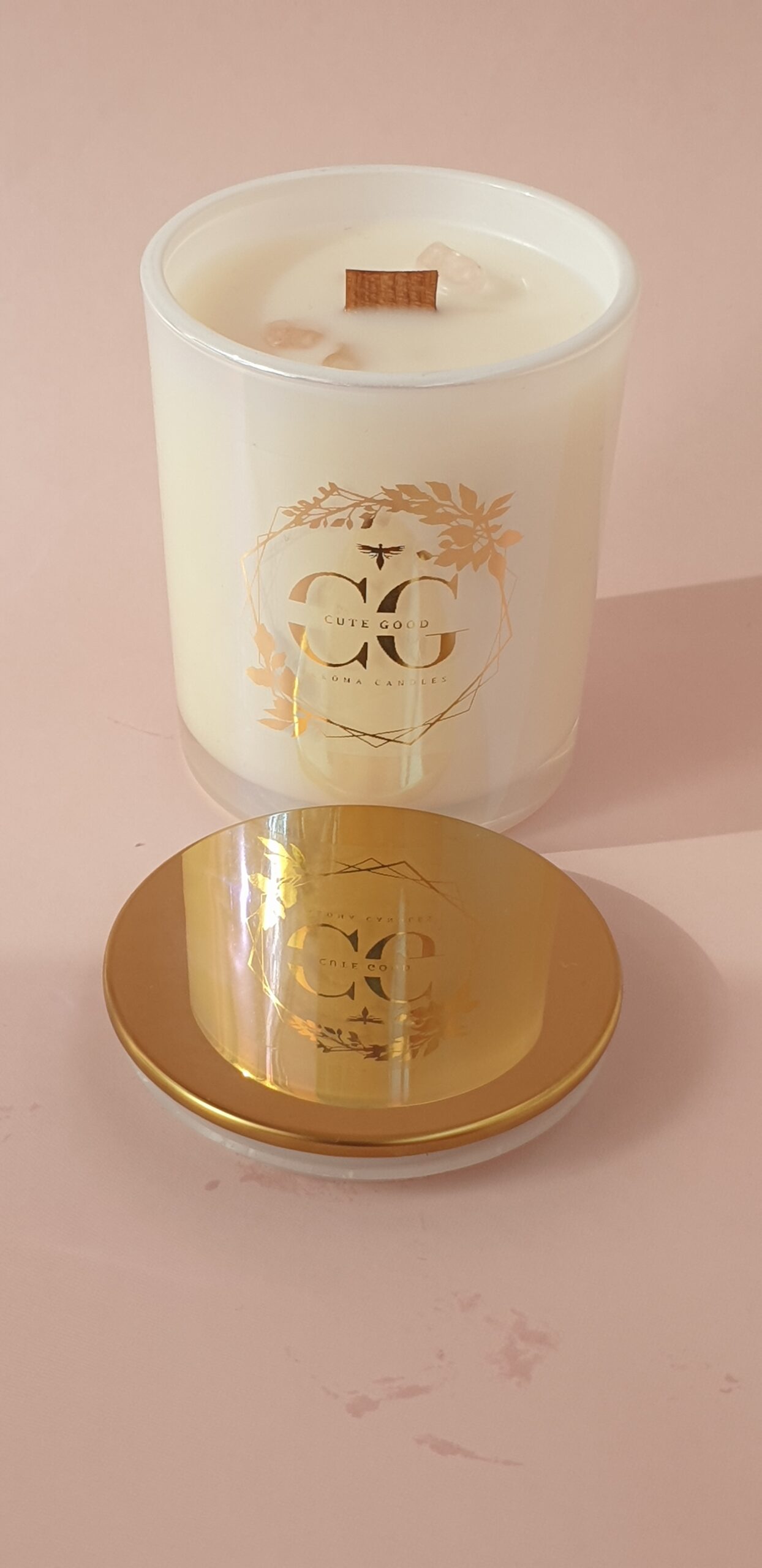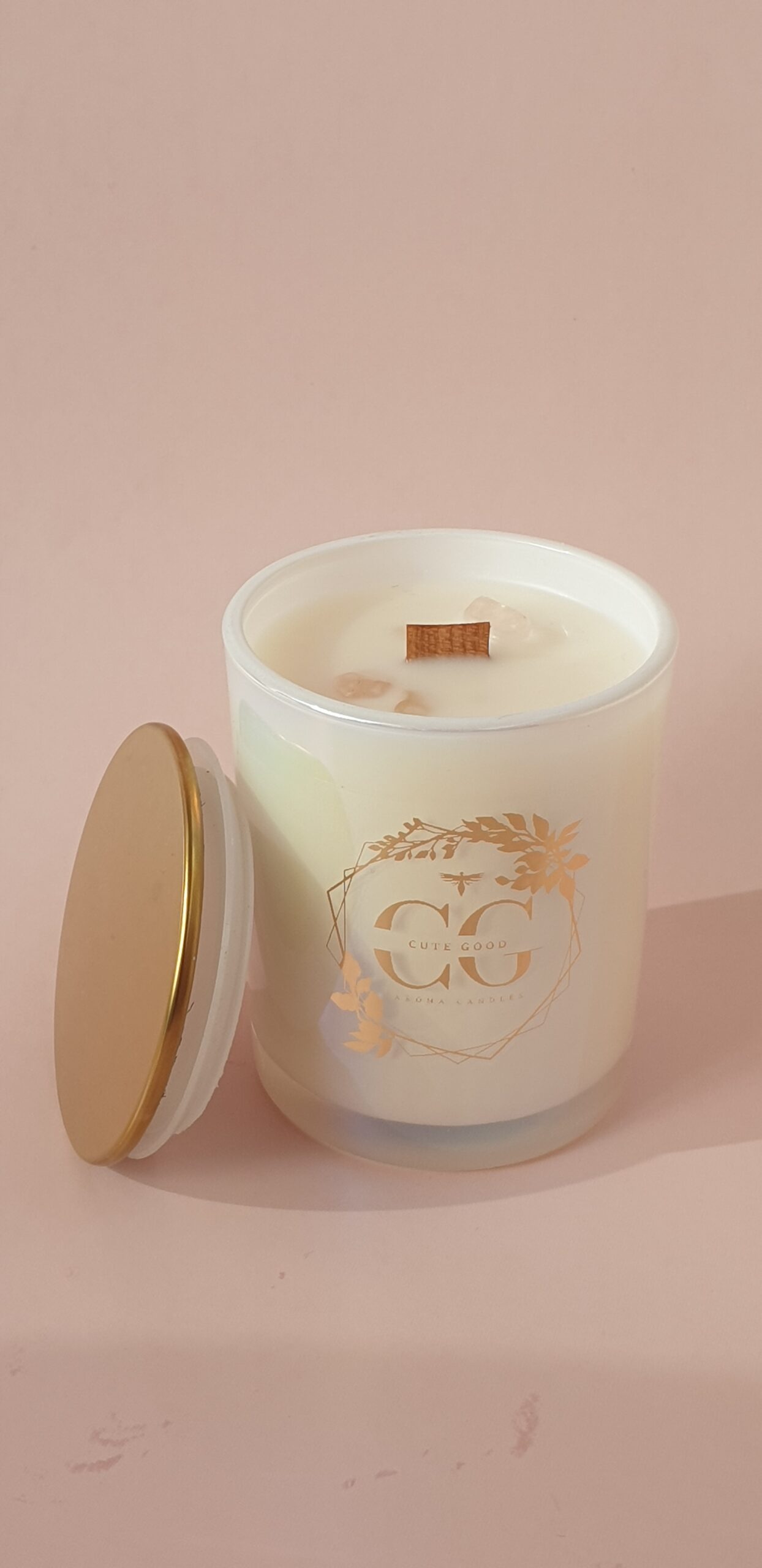 Ароматическая свеча «Аврора» с ароматом «Черное Море» в жемчужно-перламутровом стеклянном стакане, натуральный соевый воск, двойной деревянный фитиль, 200 мл., декорирована натуральным розовым кварцем