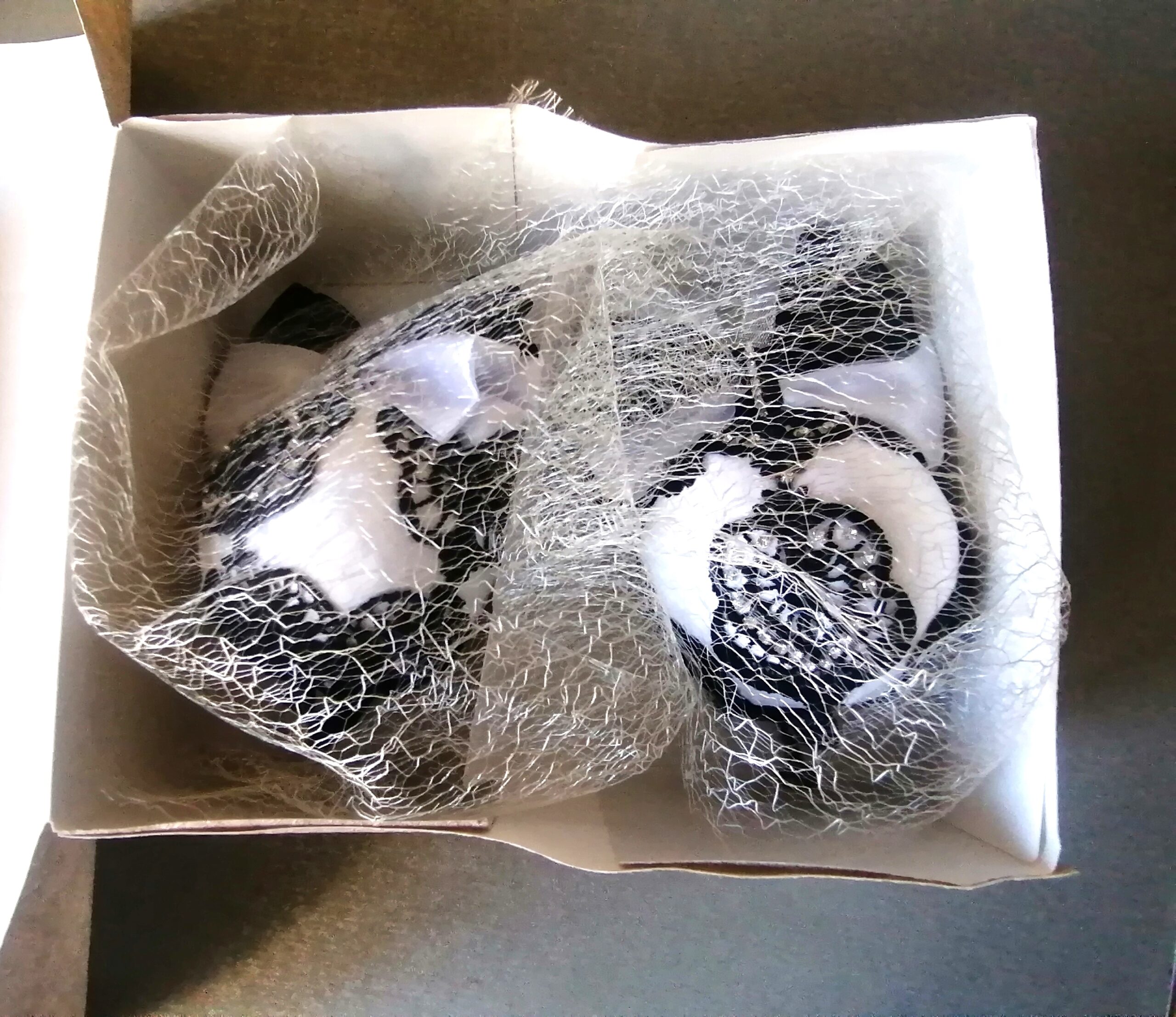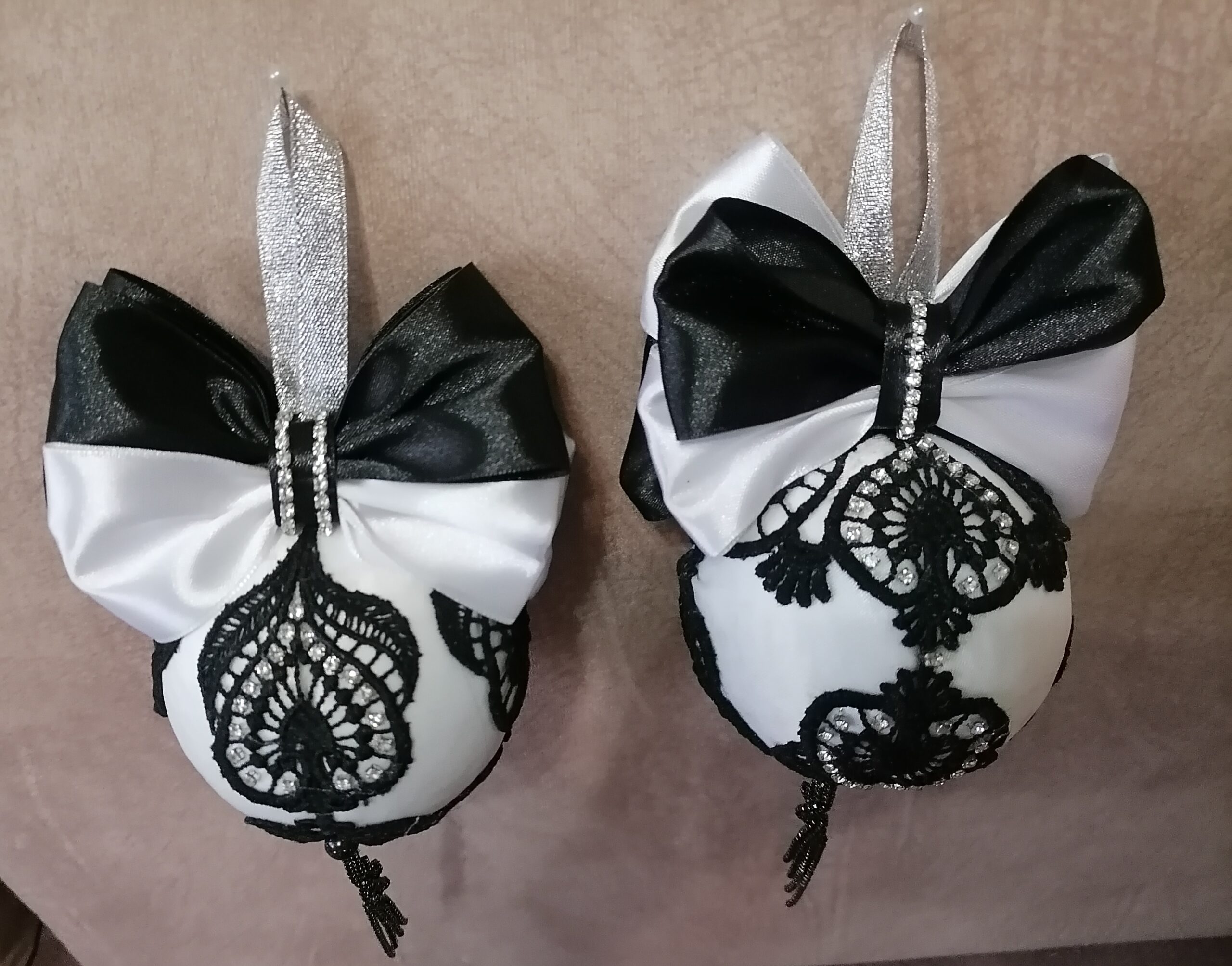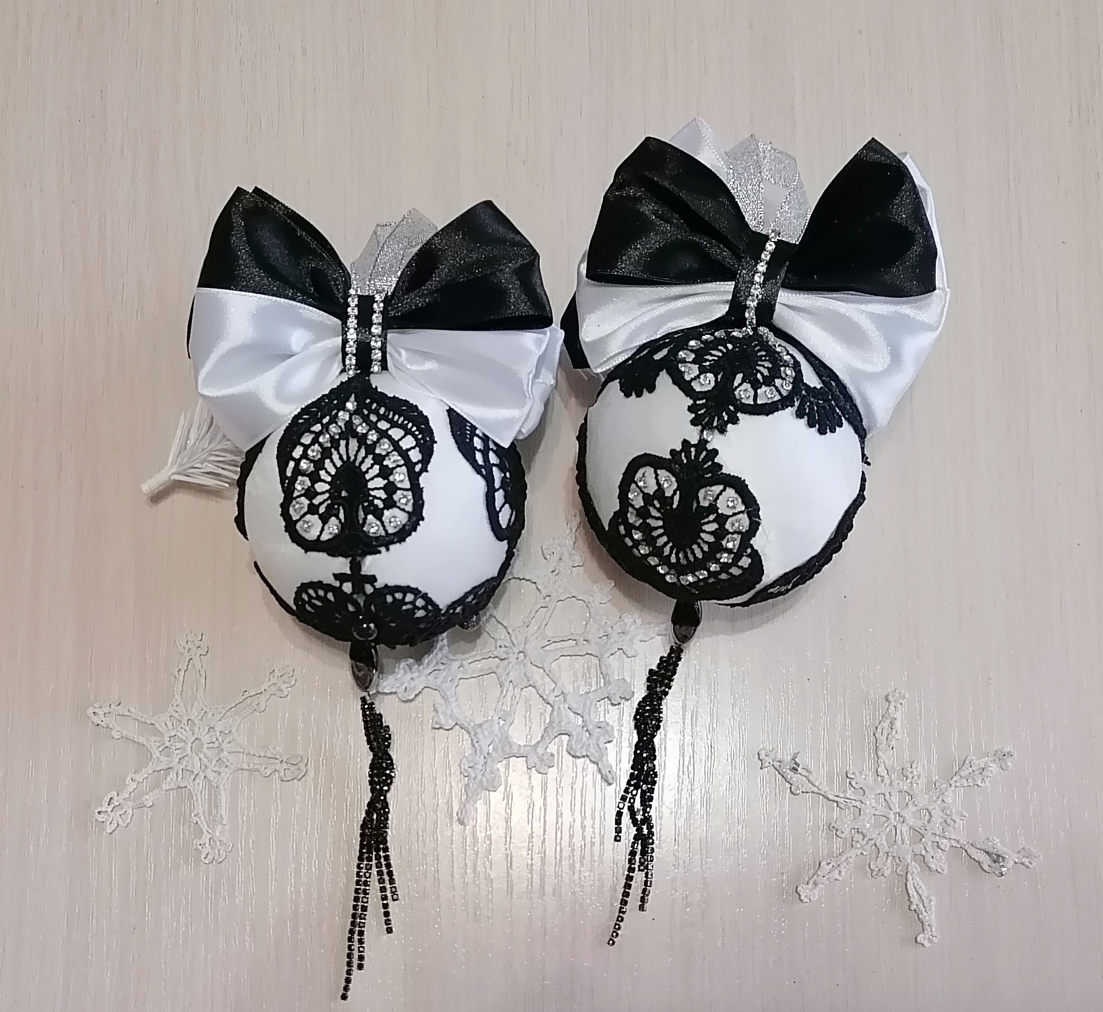 Ёлочные чёрно-белые шары сделаны из белого атласа и украшены дорогими чёрными кружевами и стразами , за счёт которых шары при освещении красиво переливаются . Низ шаров украшен перламутровым искусственным камнем и цепочкой из чёрных страз . Банты из атласных лент сделаны в стиле канзаши .