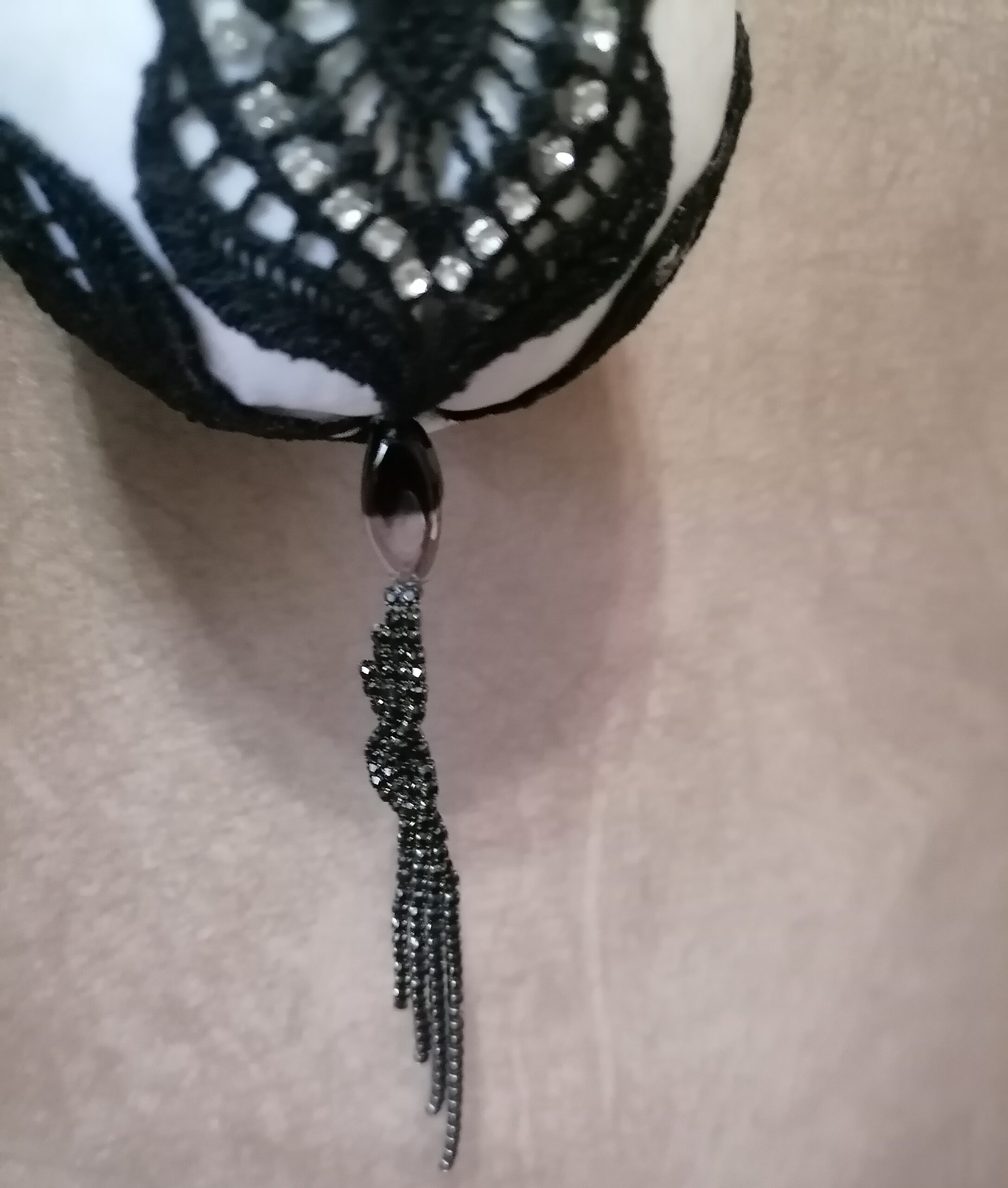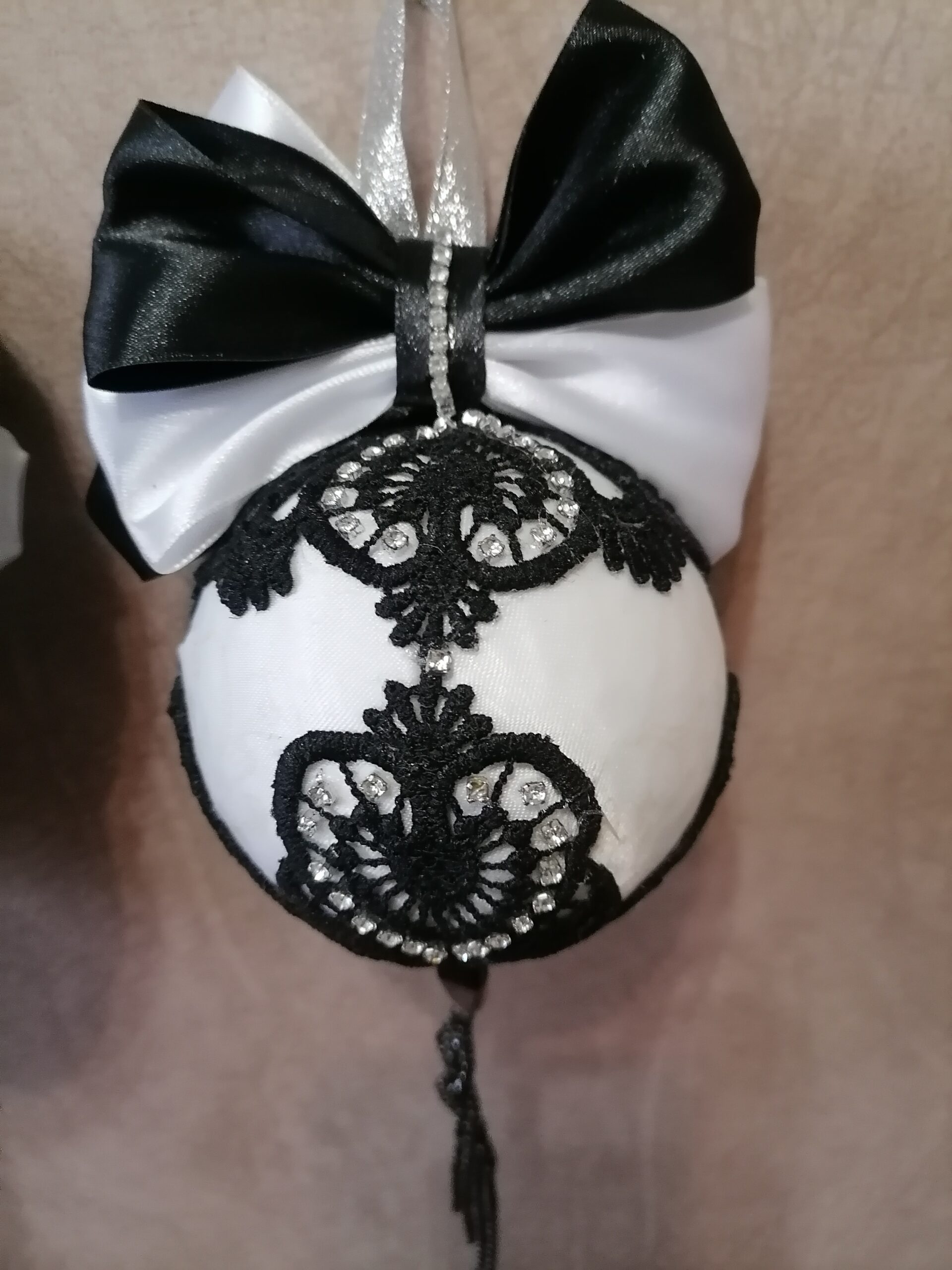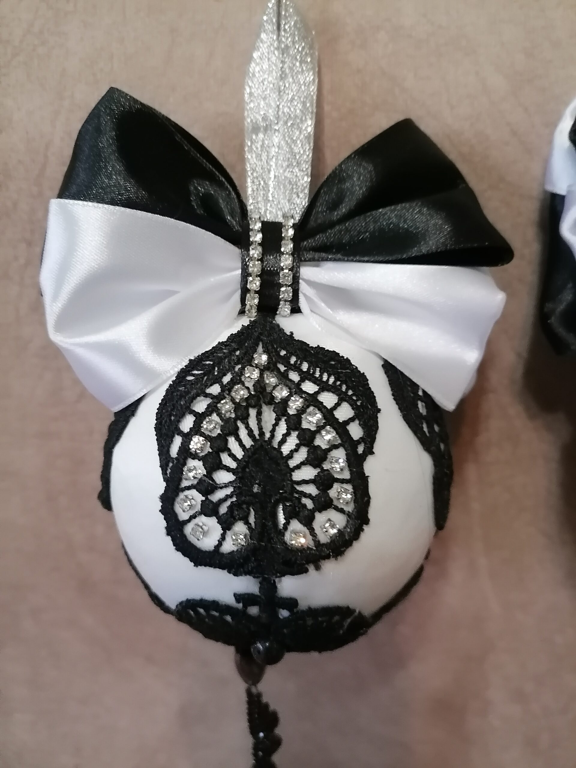 Эти шикарные чёрно-белые ёлочные шары с кружевом и стразами станут настоящим украшением вашей новогодней ёлки ! Атласные банты дополнят праздничный ансамбль , создавая неповторимую атмосферу вашего праздничного интерьера .