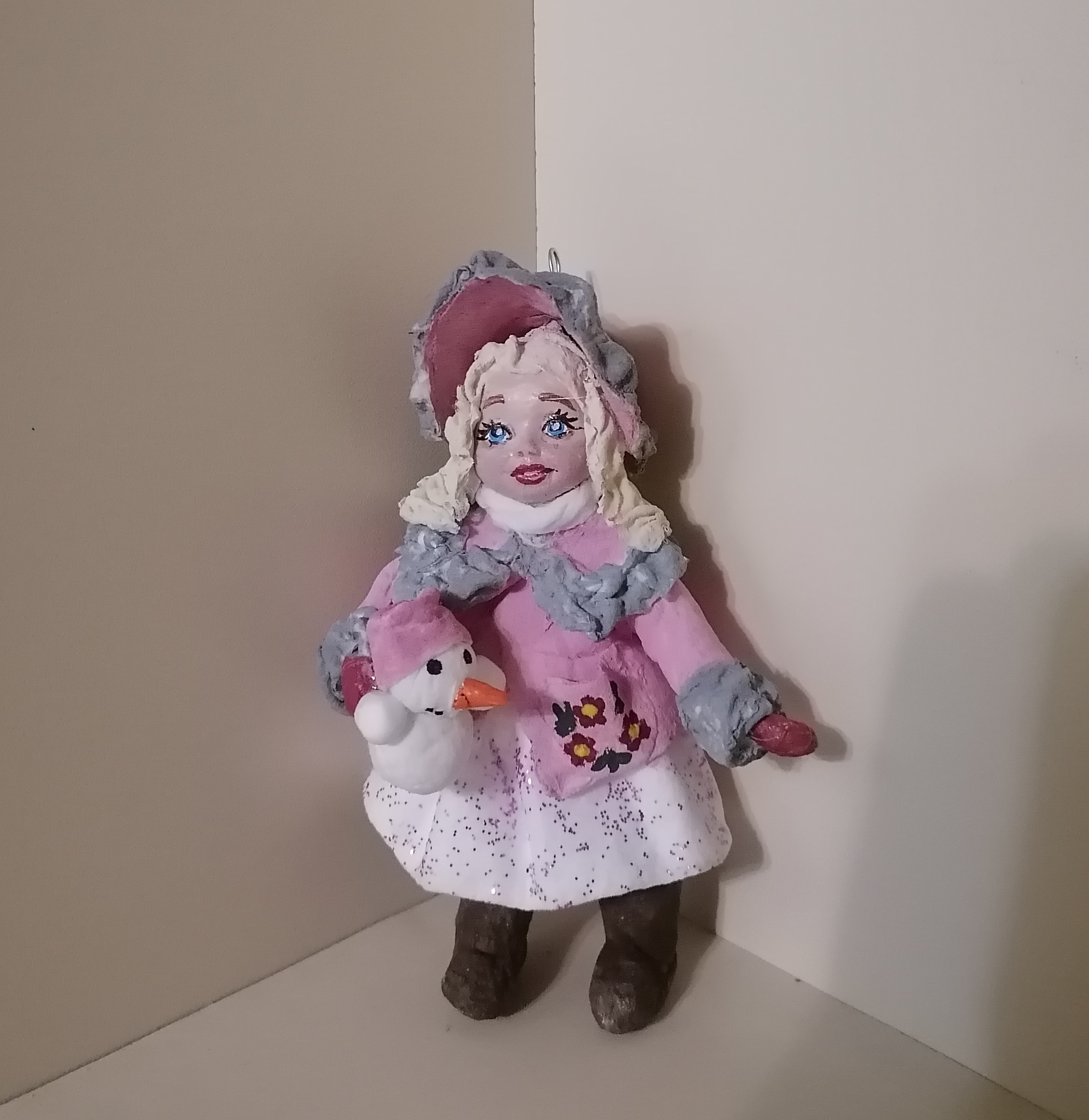 Эта милая ёлочная игрушка » Барышня со снеговиком » станет прекрасным украшением вашей новогодней ёлки , или чудесным подарком своим близким и друзьям .
