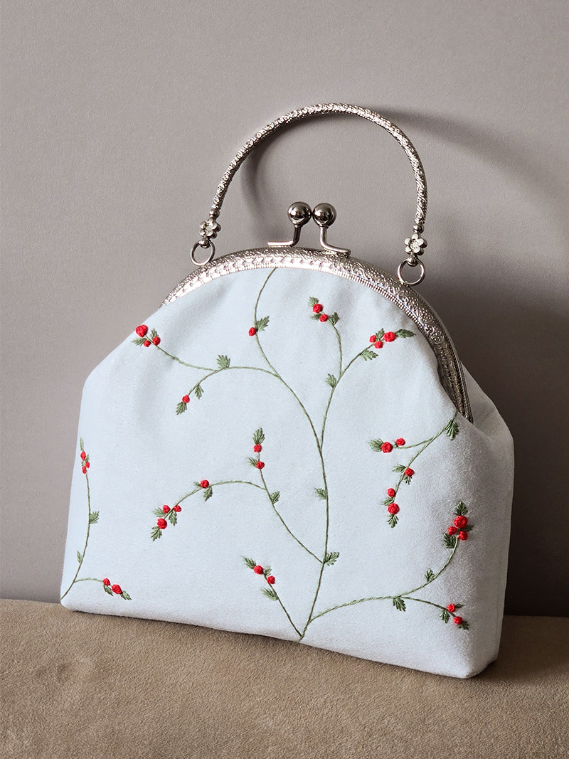 Каждая сумочка рождается в моей мастерской с особой заботой: от выбора ткани до мельчайших стежков ручной вышивки. Элегантный фермуар завершает композицию, добавляя нотку утончённости и ретро‑шика.