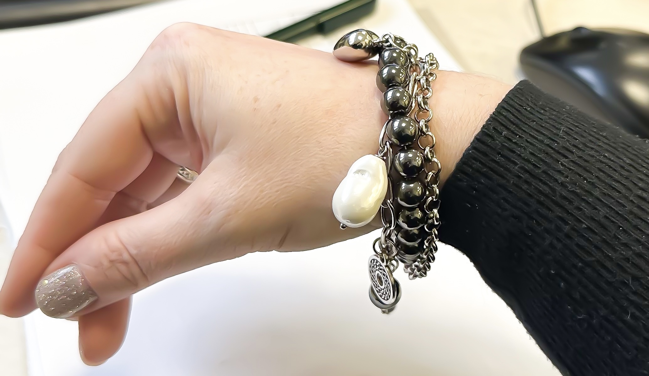 Этот браслет – настоящее произведение искусства, где гармонично сплелись природная красота и современные материалы. Основа из гладкого, глубокого гематита дополнена изящными цепочками, украшенными подвесками из прозрачного горного хрусталя, яркой майолики и снова гематита. Стальные детали придают браслету прочность и завершенный вид, делая его идеальным аксессуаром для любого случая.