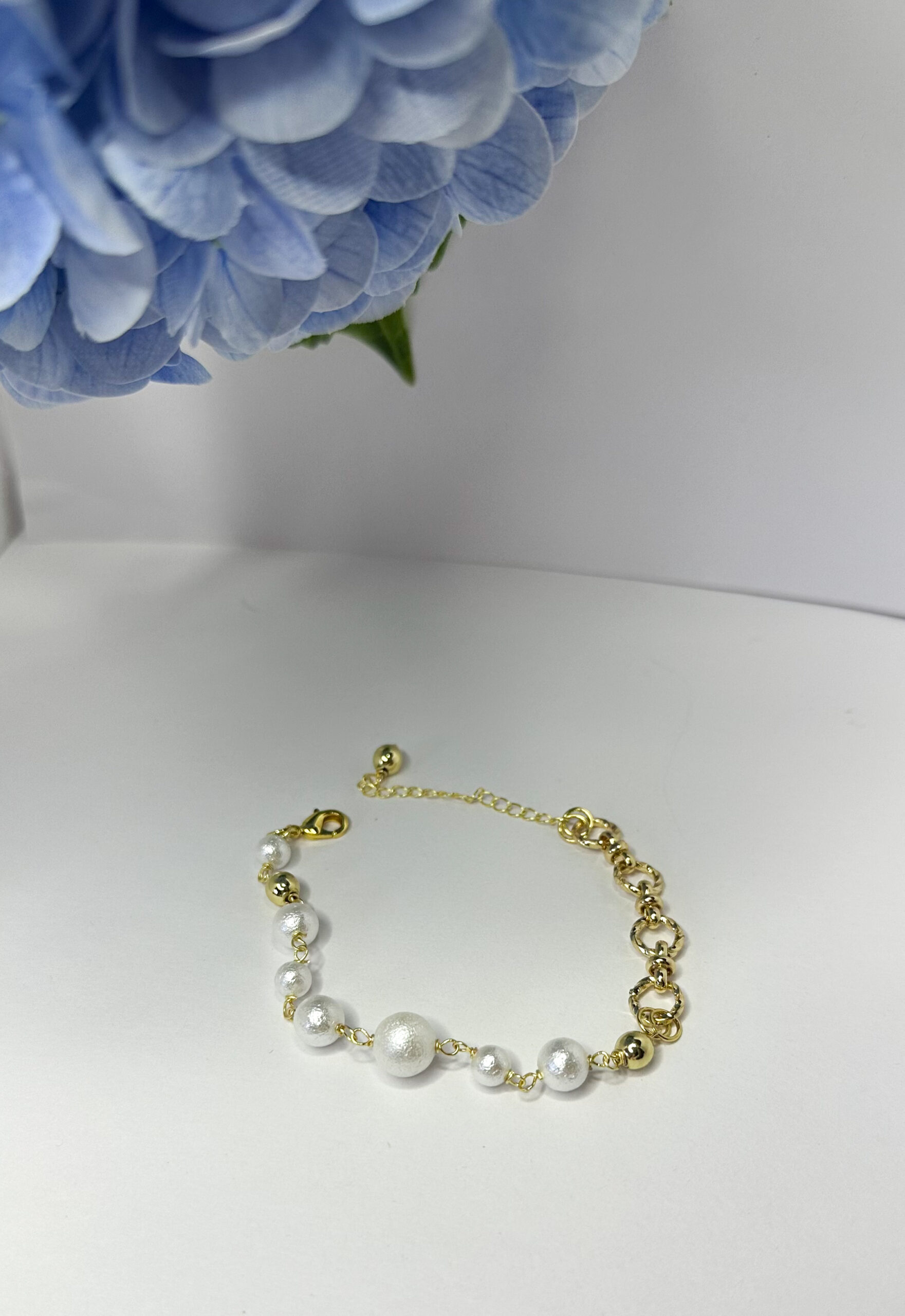 Браслет из хлопкового жемчуга с цепочкой. Фурнитур под золото премиум класса. Браслет на запястье 16-17 см+3 см цепочка.