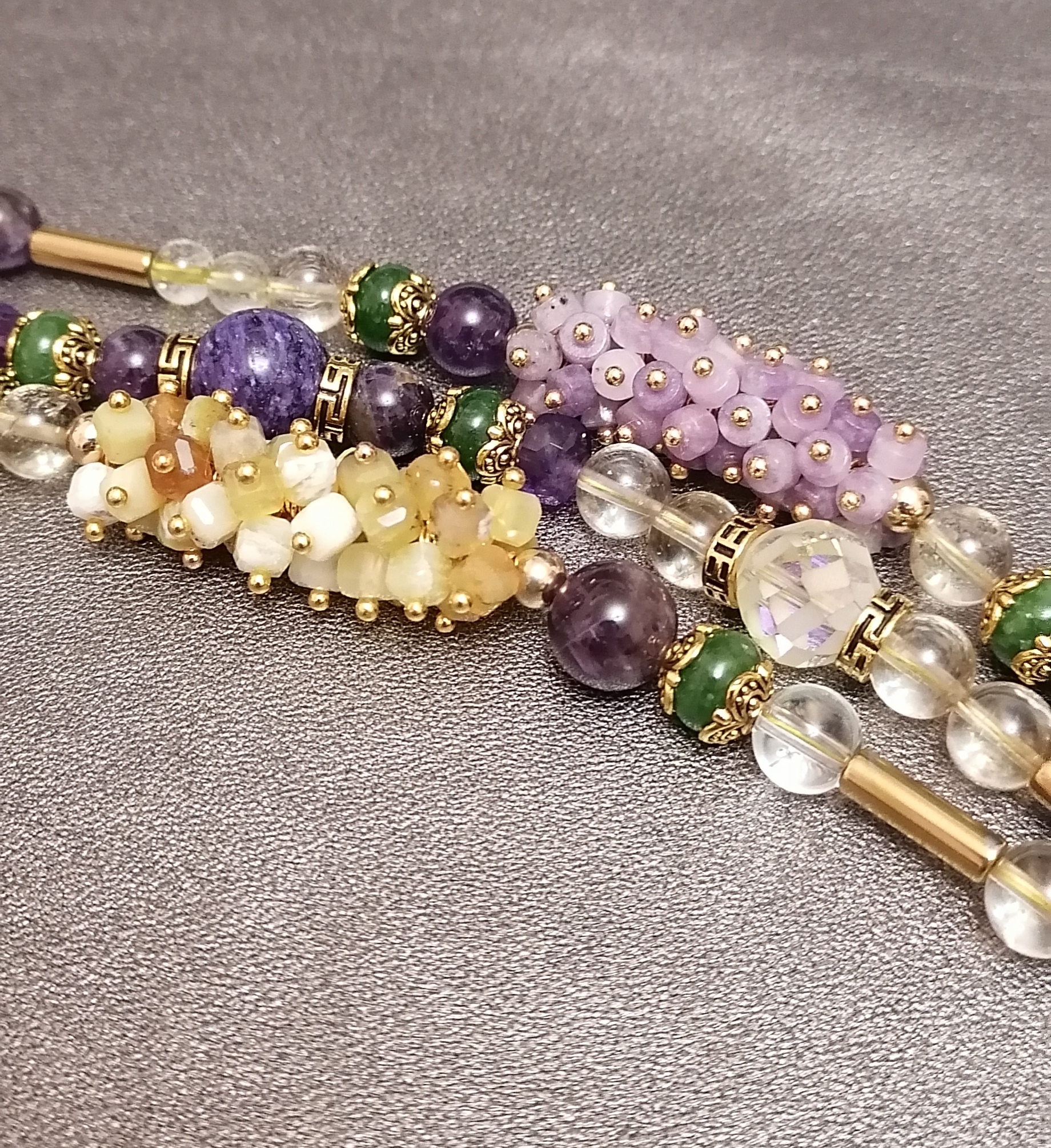 Этот многослойный браслет выглядит очень утонченно и благородно.Сочетание лавандовых, глубоких фиолетовых, нежно-зеленых и золотистых оттенков создает образ, одновременно напоминающий о цветущем саде и античных украшениях.