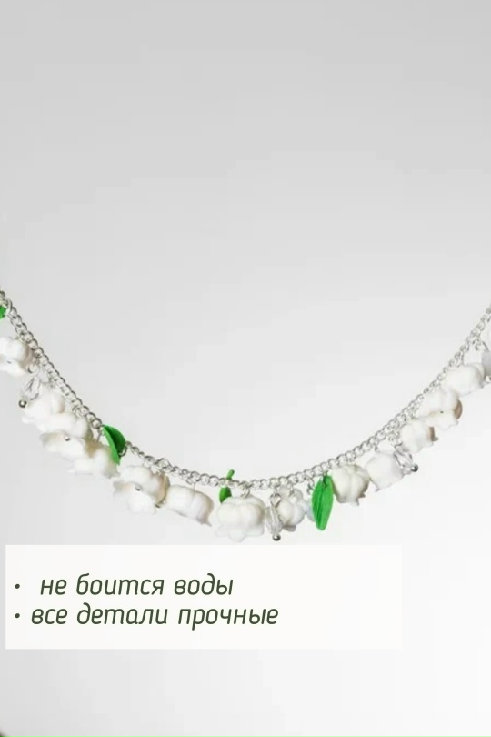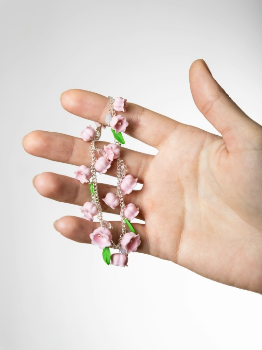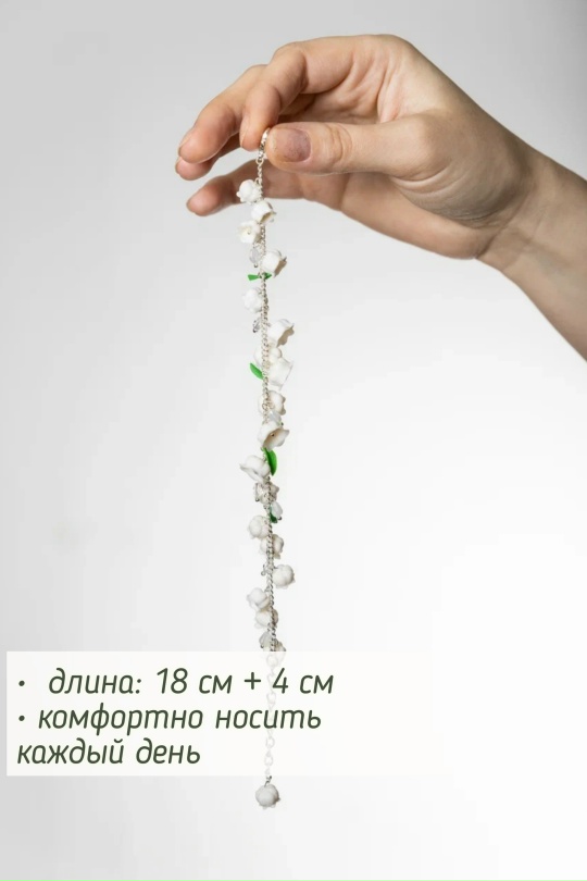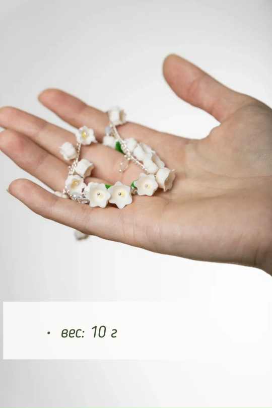 Каждый ландыш изготовлен вручную из полимерной глины с использованием техники лепки и формирования. Нежный белый цвет придает браслету легкость и женственность, а детали лепки делают их похожими на живые цветы.