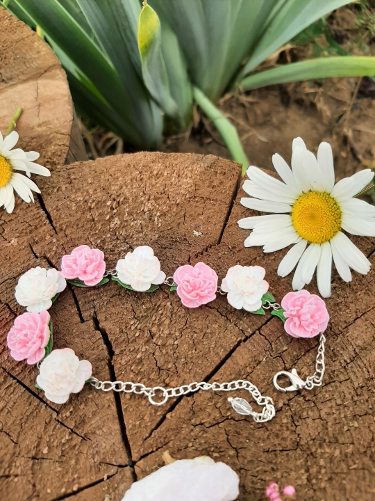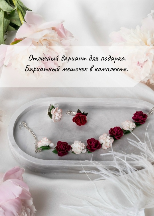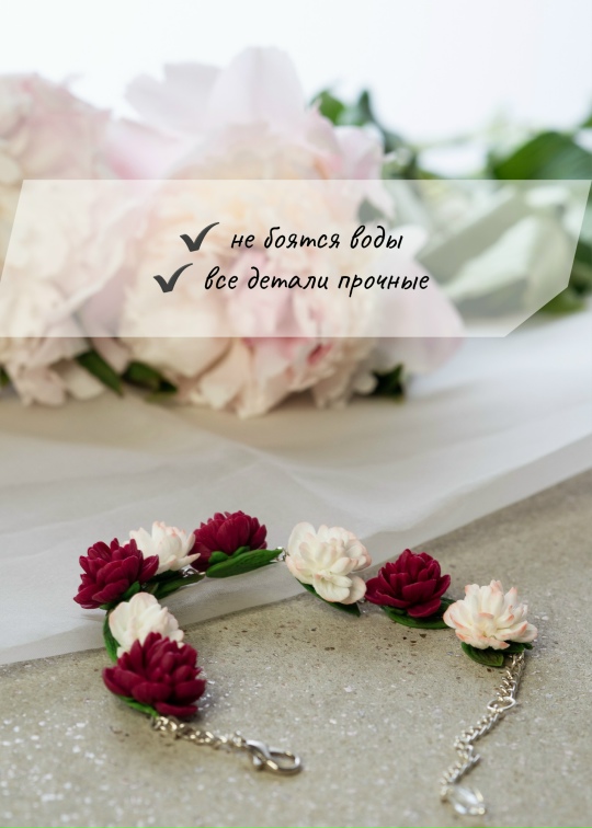 Возможен заказ браслета с пионами в разных расцветках: розовый, белый, марсала или асимметричный комплект. А также изготовление под заказ подвески или кольца с пионами в комплект к браслету.