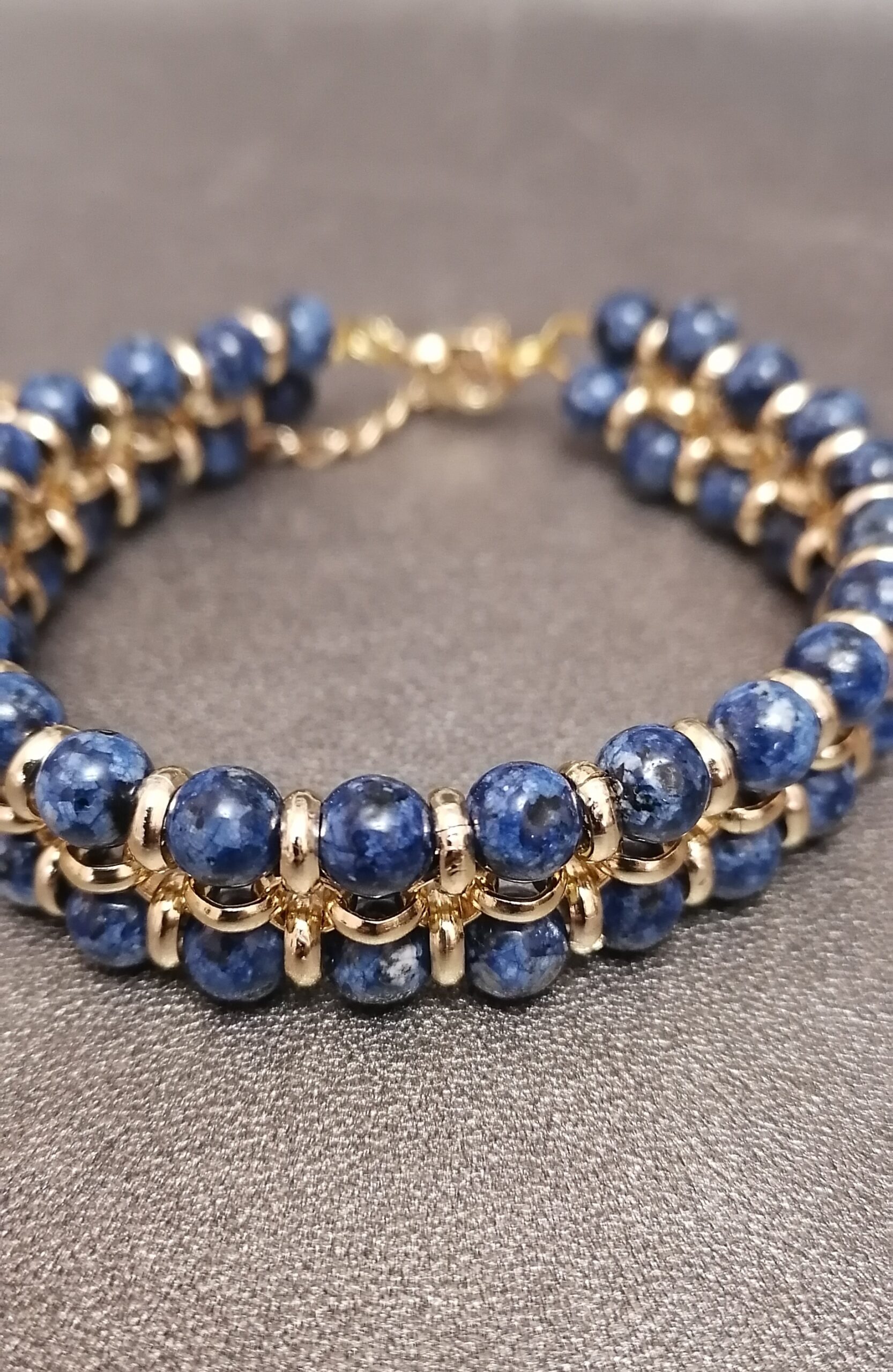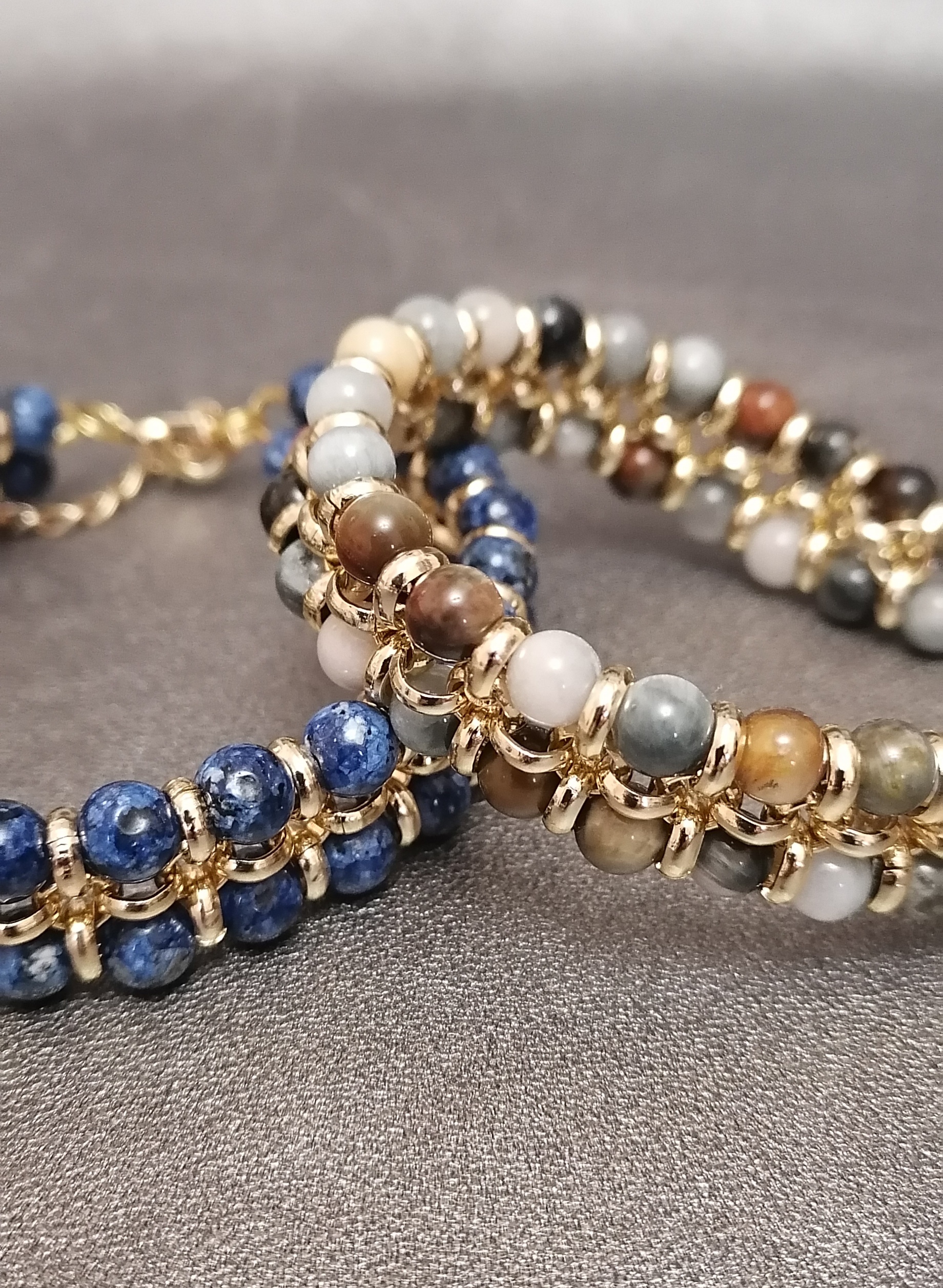 Эти браслеты выполнены в технике кольчужного плетения из золотистых колечек с использованием природного кошачьего глаза теплых землистых оттенков и синей яшмы. Очень хорошо сидят на запястье, легкие.