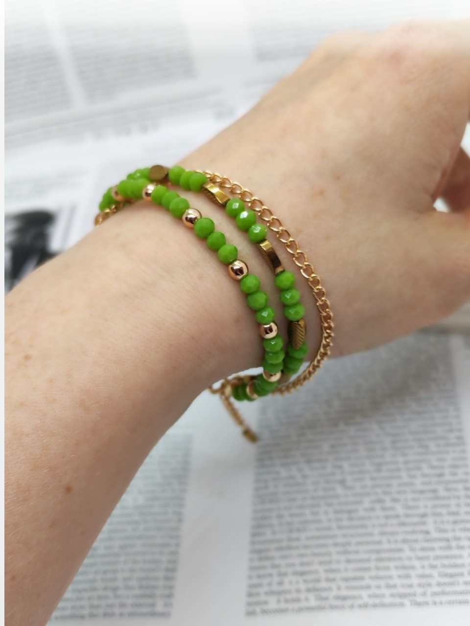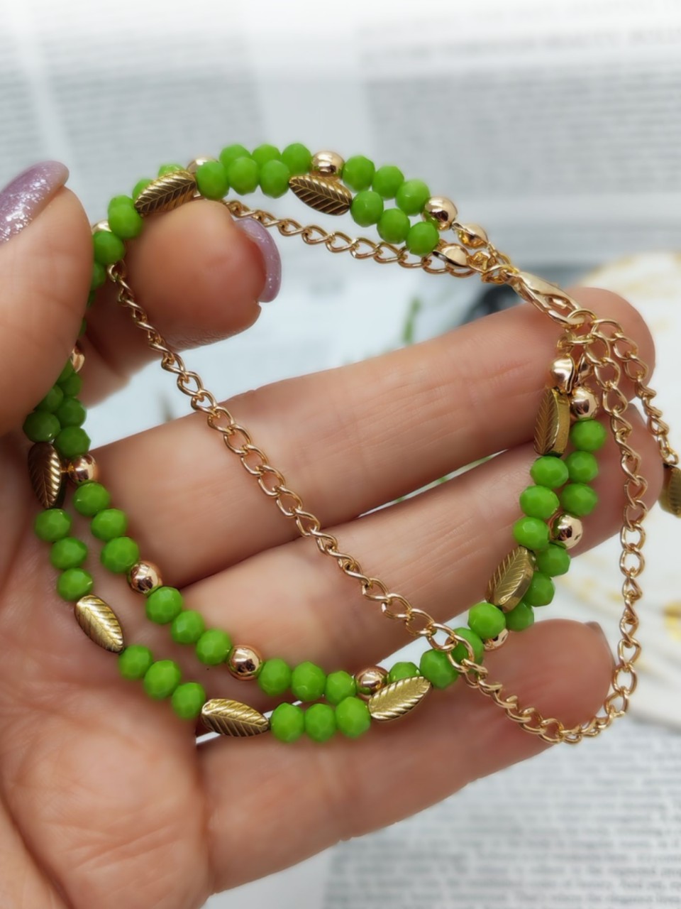 · Золотые элементы — цепочка и декоративные вставки — добавляют браслету роскоши и элегантности. Блестящие шарики и прямоугольные детали гармонично сочетаются с зелёными бусинами.