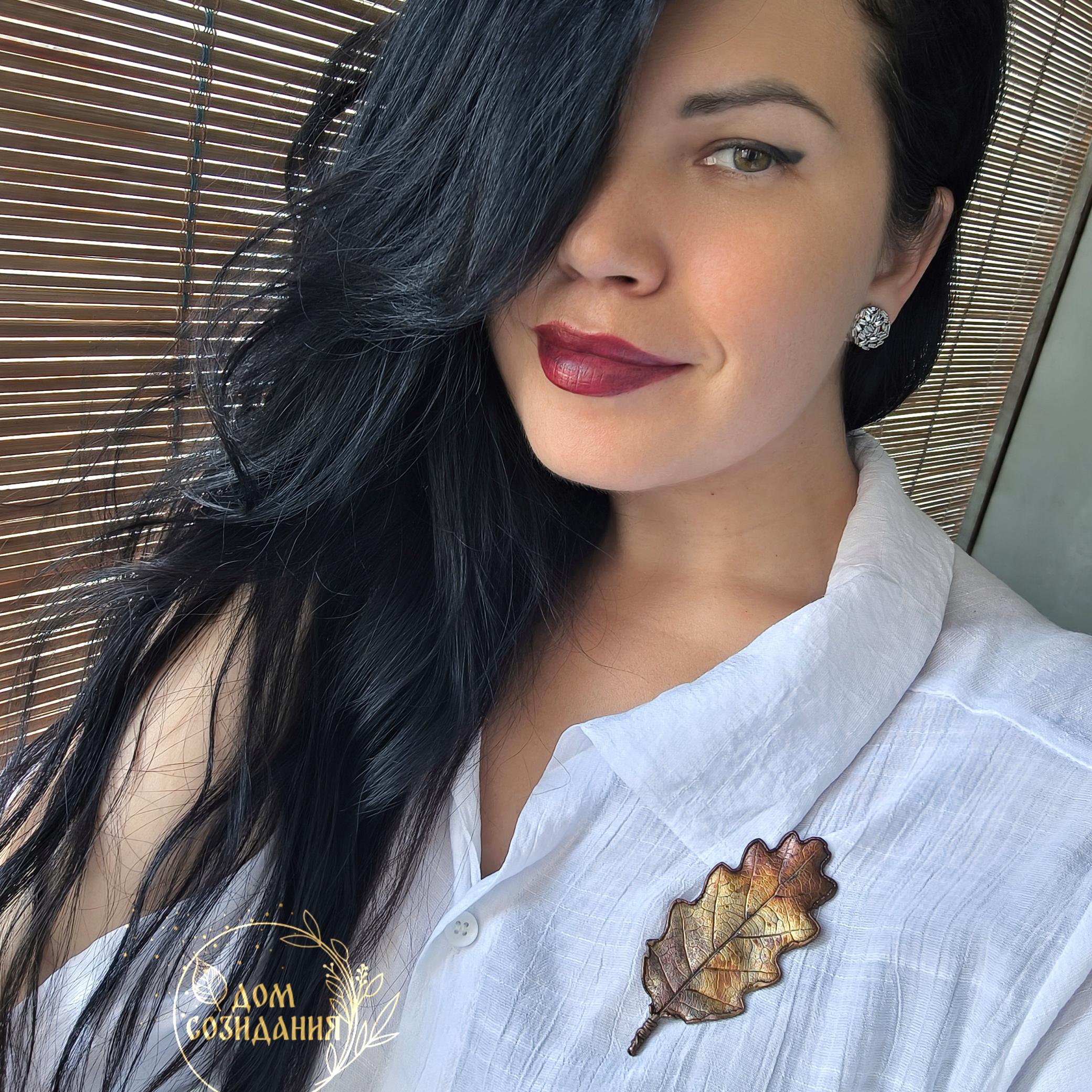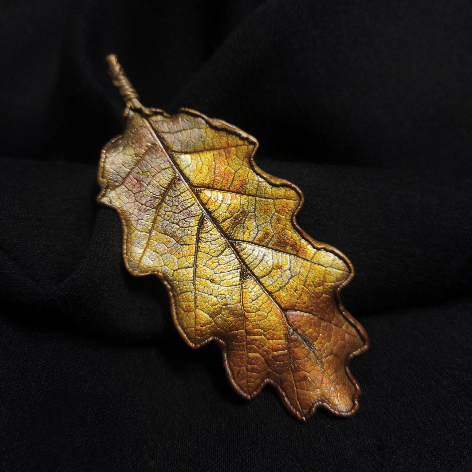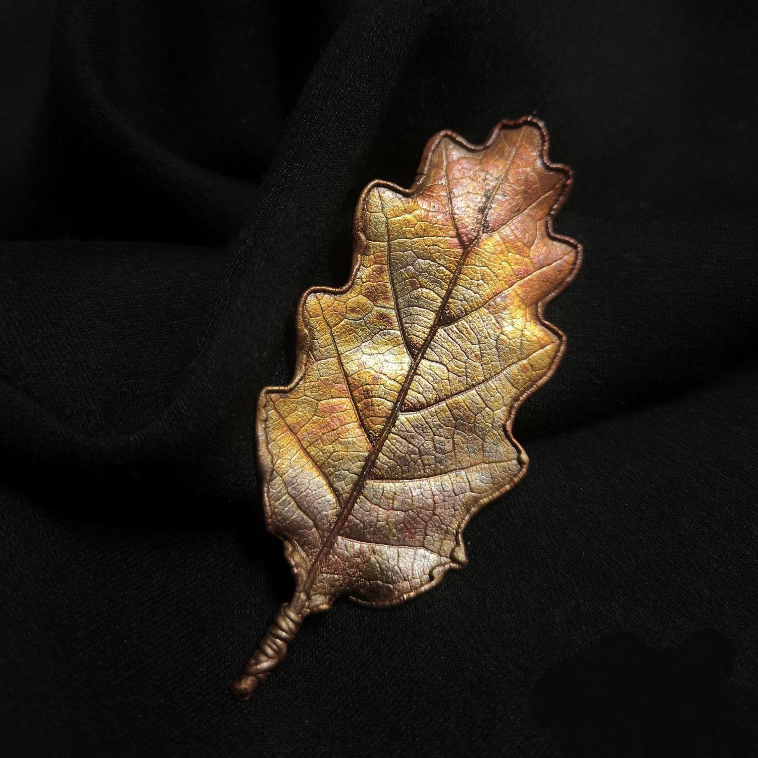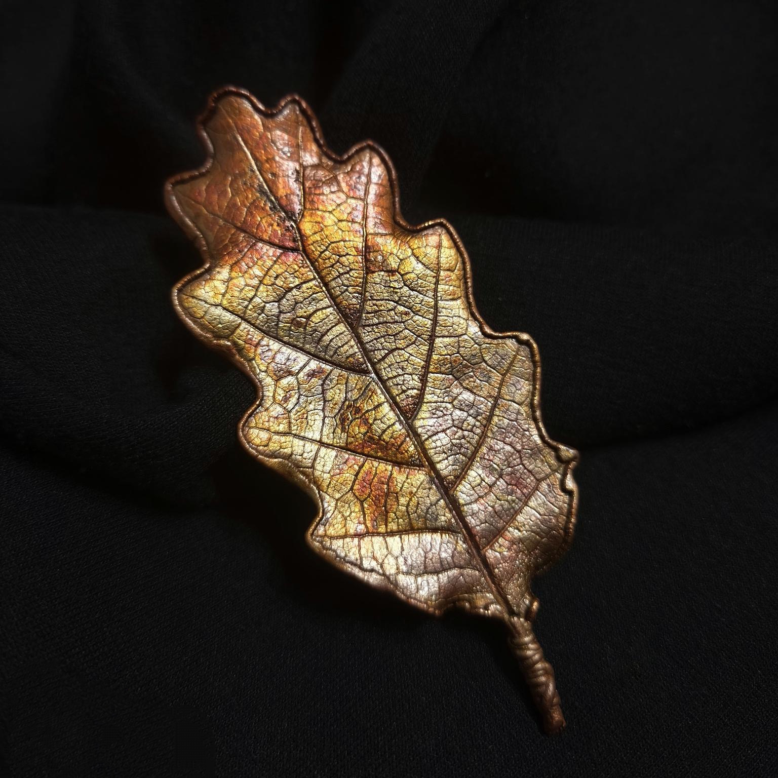 Изысканная брошь — лист благородного крымского черешчатого дуба — растения, которое встречается только в Крыму. Техника гальванопластика позволила с удивительной точностью передать мельчайшие детали: каждая прожилка листа словно ожила, превратившись в сложный, завораживающий узор. Оттенки броши напоминают краски золотого заката — здесь переплелись тёплый жёлтый, глубокий медный и сияющий золотой, создавая ощущение солнечного света, застывшего в металле. Лист кажется не просто украшением, а частицей природы, бережно заключённой в изящную форму. Брошь на магните словно хранит в себе дыхание крымских лесов, их мощь и величие. Игра света на фактурной поверхности листа вызывает ассоциации с осенним солнцем, пробивающимся сквозь листву. Это не просто аксессуар, а маленькое произведение искусства, в котором слились природная красота и мастерство художника.