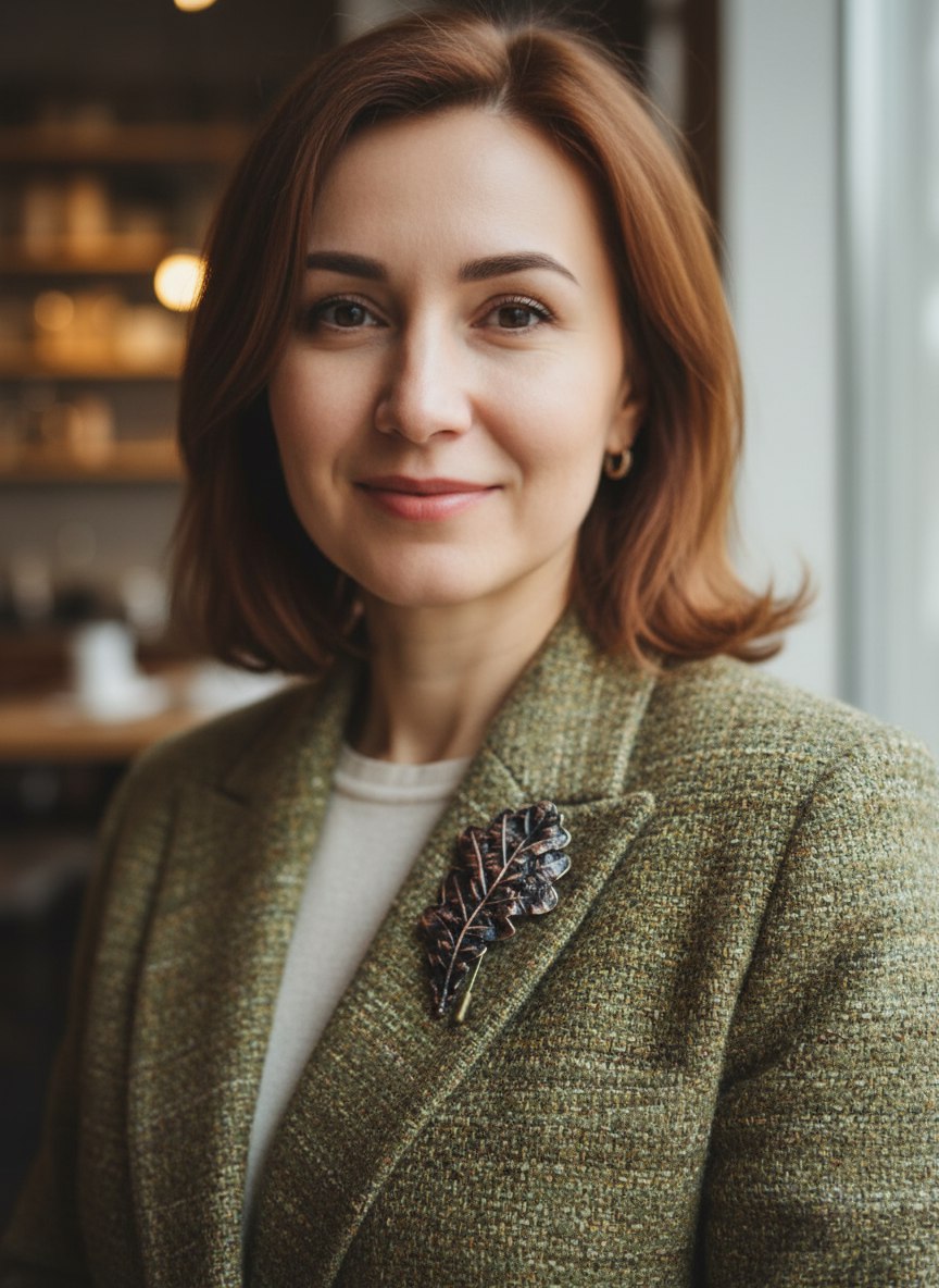 Брошь-игла из дубового листочка. Для комплекта можно подобрать серьги.