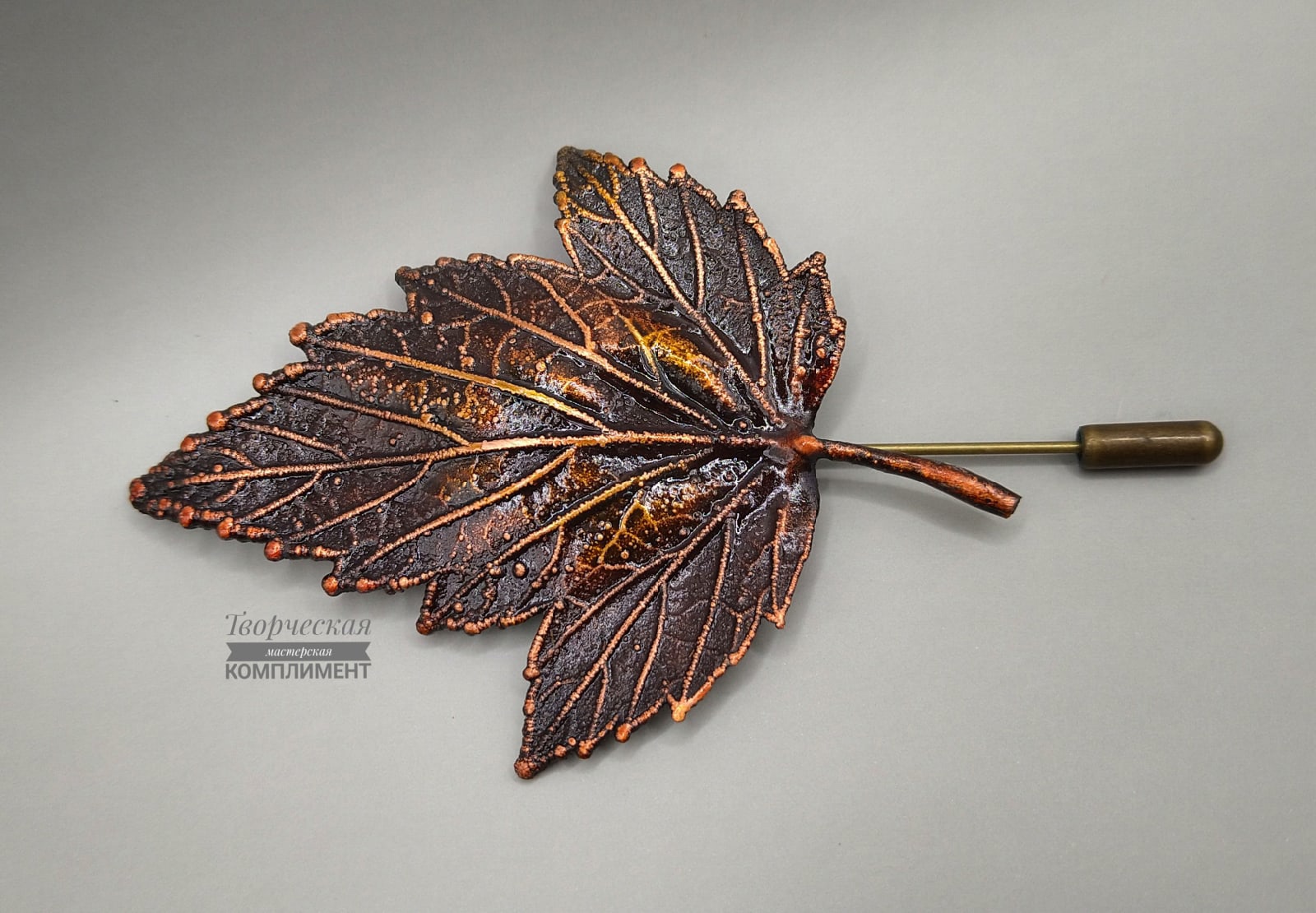 Небольшая брошь-игла из листочка черной смородины. Покрытие — чернение, витражная краска