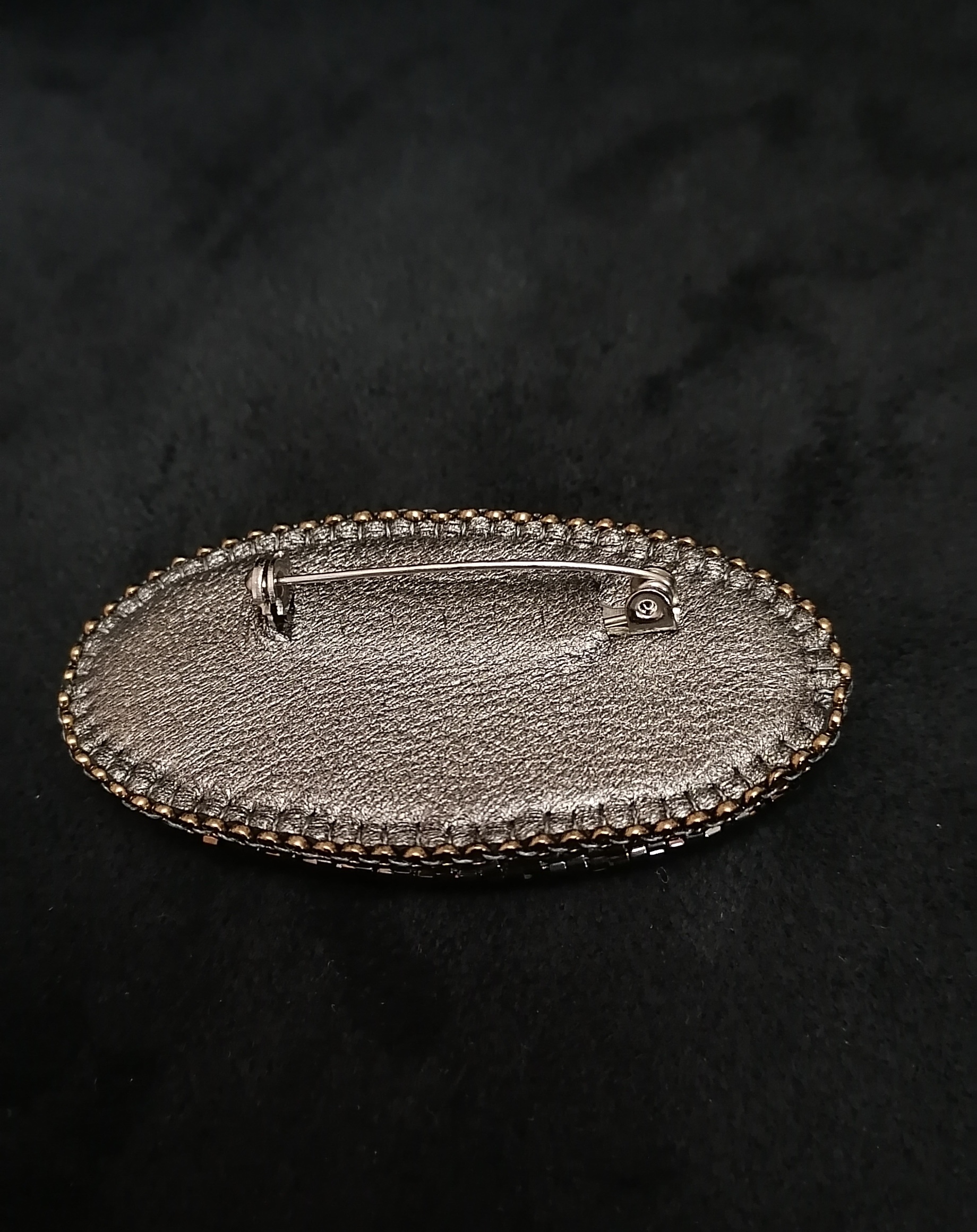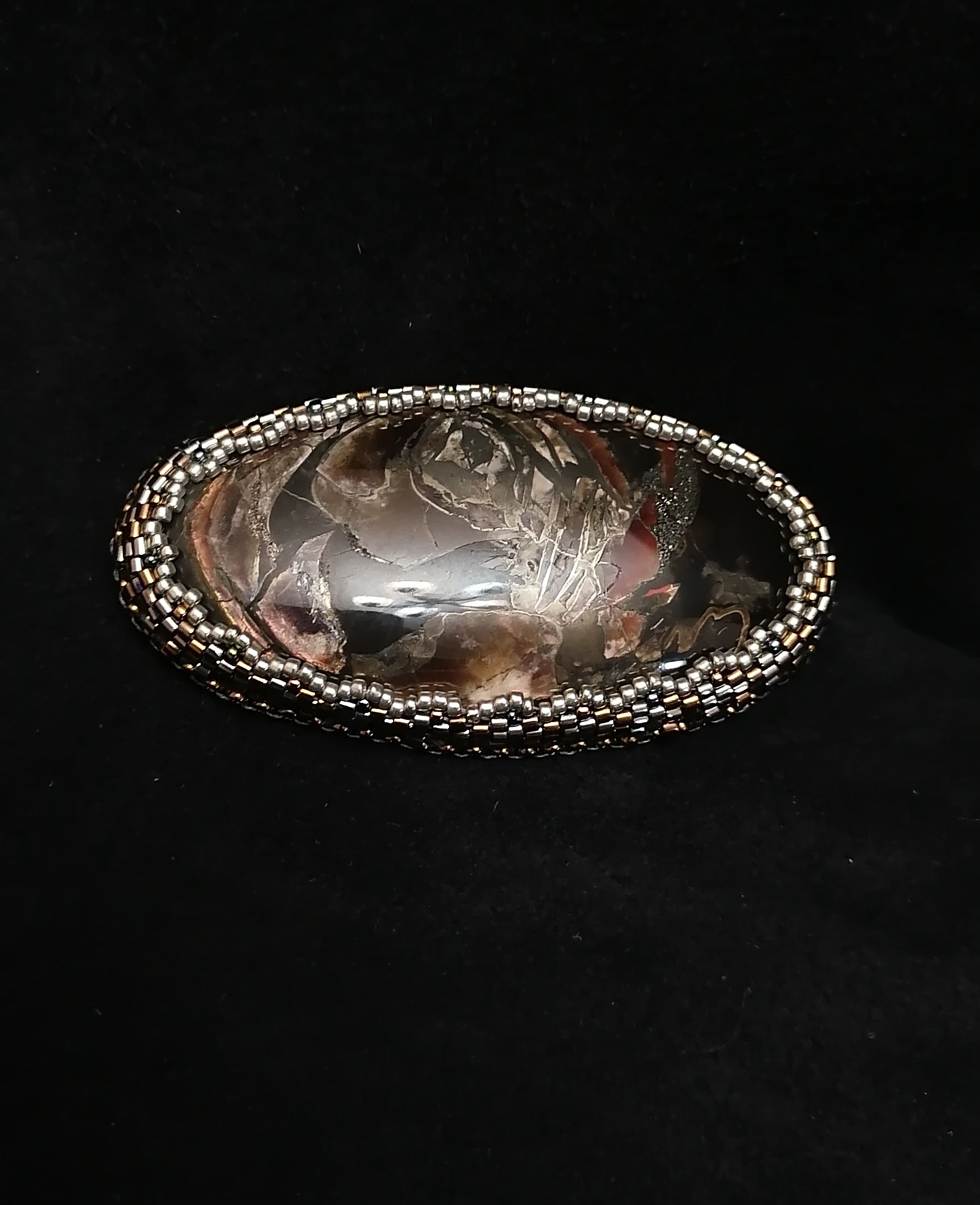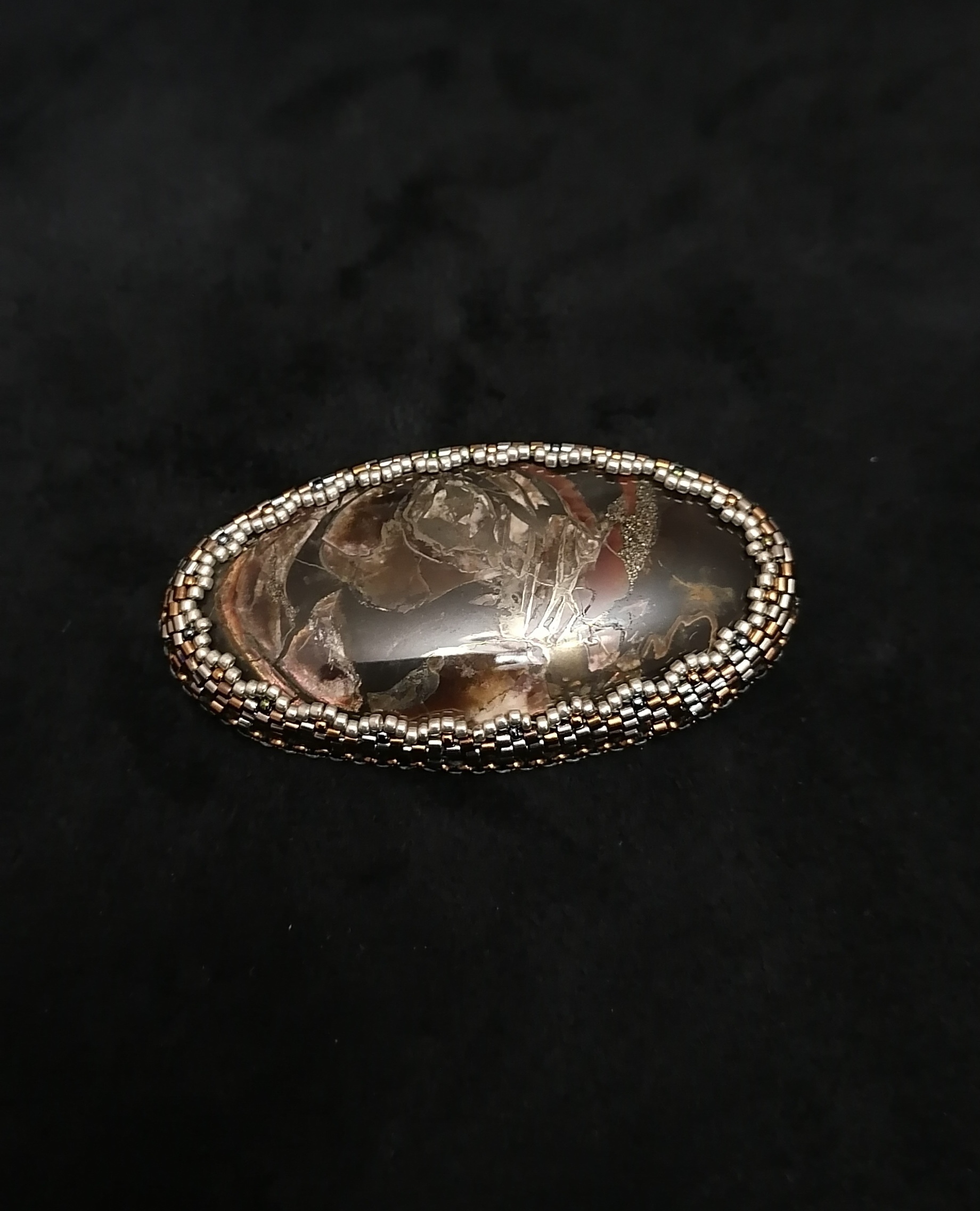 Камень оплетен японским бисером миюки делика и тохо. Брошь на кожаной основе, на стальной булавке, хорошо уравновешена и не оттягивает одежду. Хорошо будет смотреться под воротником рубашки, на лацкане пиджака, на шапке либо шарфе.