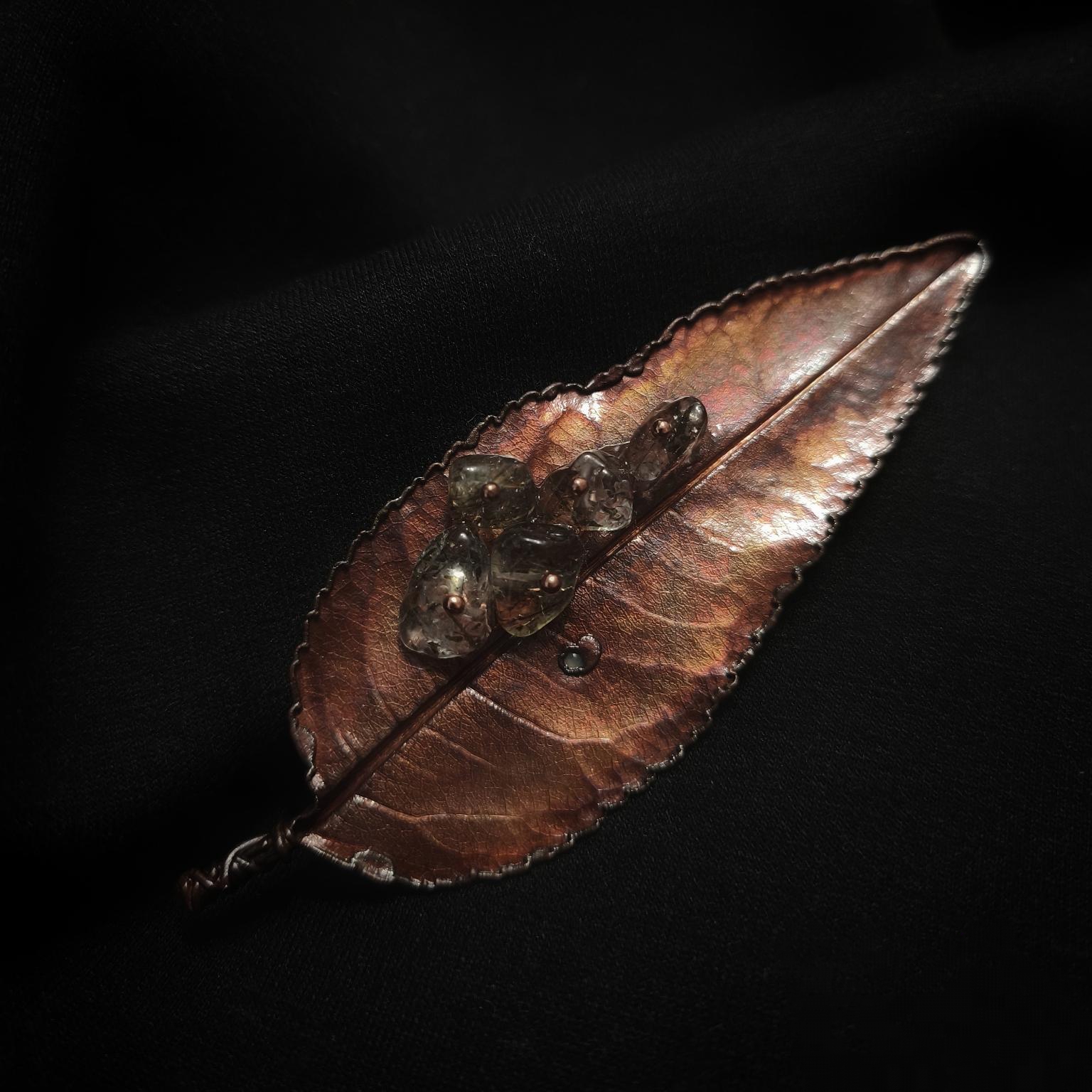 Эта изысканная брошь в виде листа миндаля — настоящий шедевр природного искусства. Сотканная из осеннего уюта и магии металла, она словно живой лист, хранящий в себе секреты древних лесов. Филигранная точность исполнения, благодаря технике гальванопластика, которая передаёт каждую прожилку листа, сохраняя его природную точность. Оттенок тёмного шоколада окутывает изделие бархатистым сиянием, придавая ему глубину и загадочность. В центре композиции уютно расположились камни кварц-волосатик — их полупрозрачная чистота контрастирует с насыщенным тоном металла, добавляя украшению нотку загадочности. Эта брошь на магните не просто аксессуар, а маленькое произведение искусства, где природа и мастерство слились воедино, чтобы рассказать свою неповторимую историю.