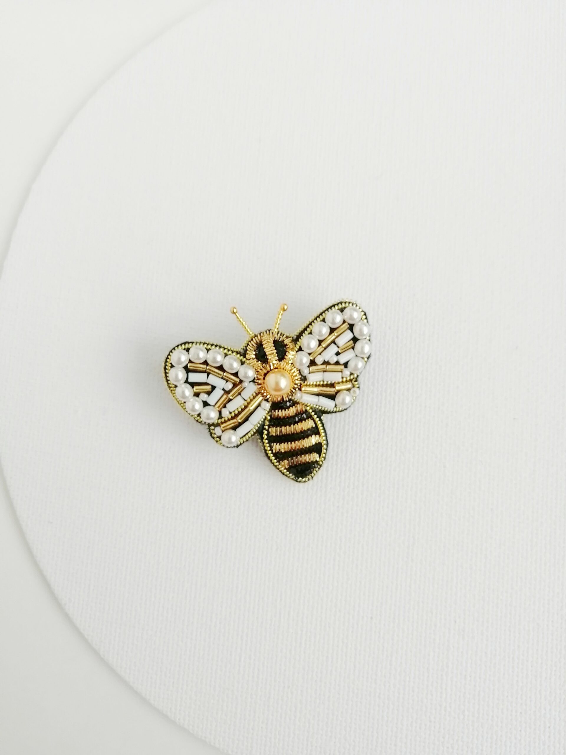 Брошь Пчела вышита на фетре с использованием японского бисера, мягкой канители, чешского жемчуга