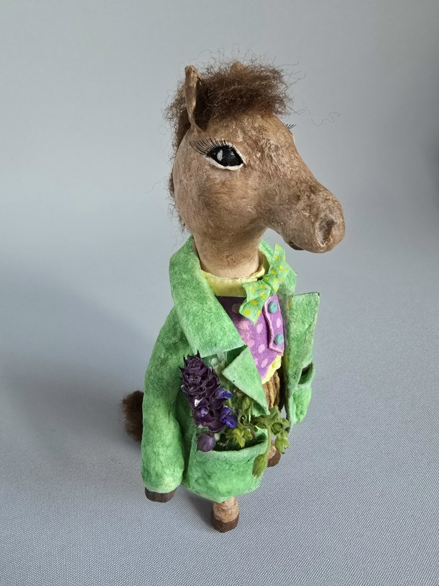 Галантный конь,облаченный по последней моде! Его зеленое пальто, рубашка и галстук-бабочка говорят о безупречном вкусе. Этот джентльмен принесет в ваш дом не только дух праздника, но и энергию стабильности, успеха и процветания в новом году.