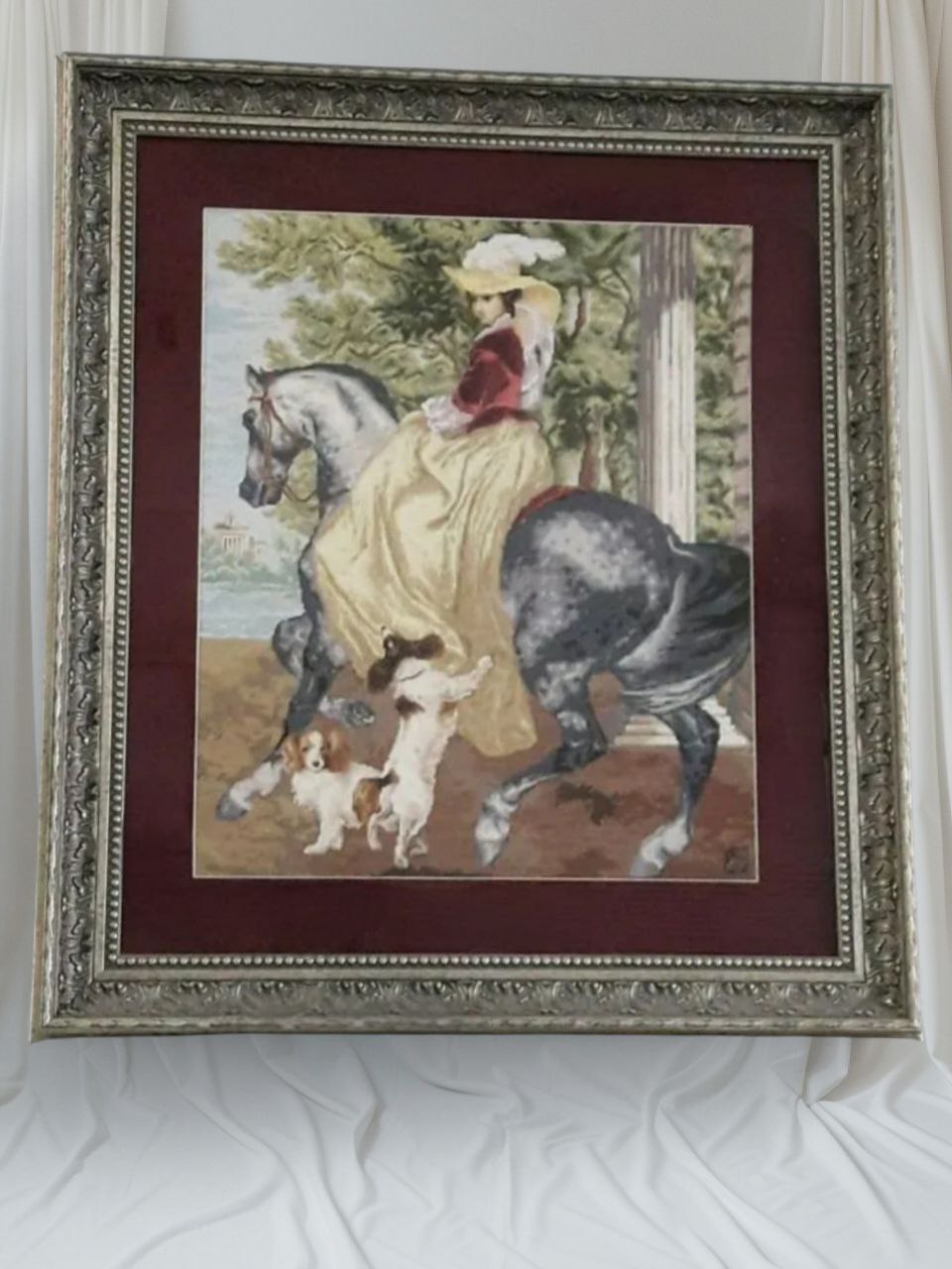 Вышивка крестом «Всадница» — полная обшивка. Размер: 53×60 см. Изумительная ручная работа, профессиональное багетное оформление, бархатное паспарту, защитное стекло. Шикарный подарок для любого события!