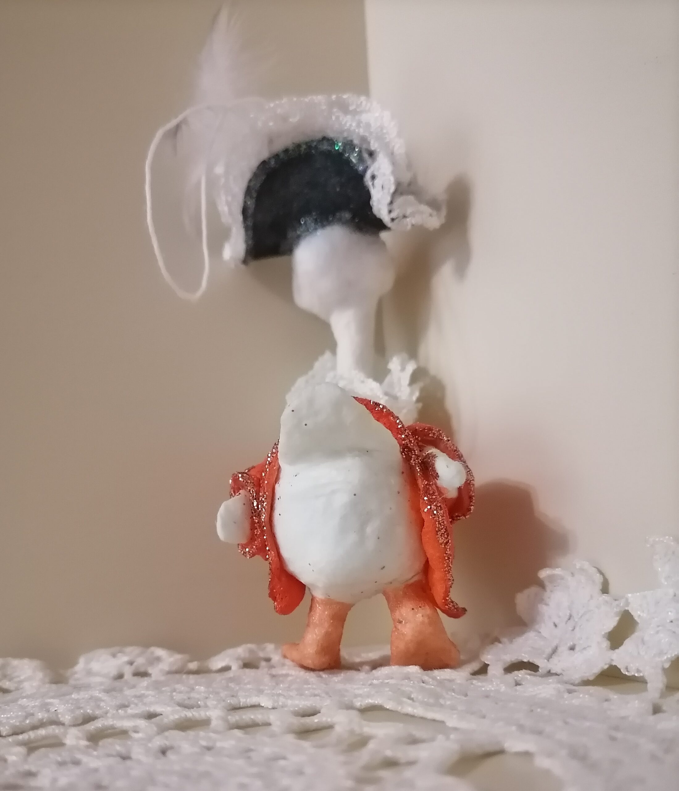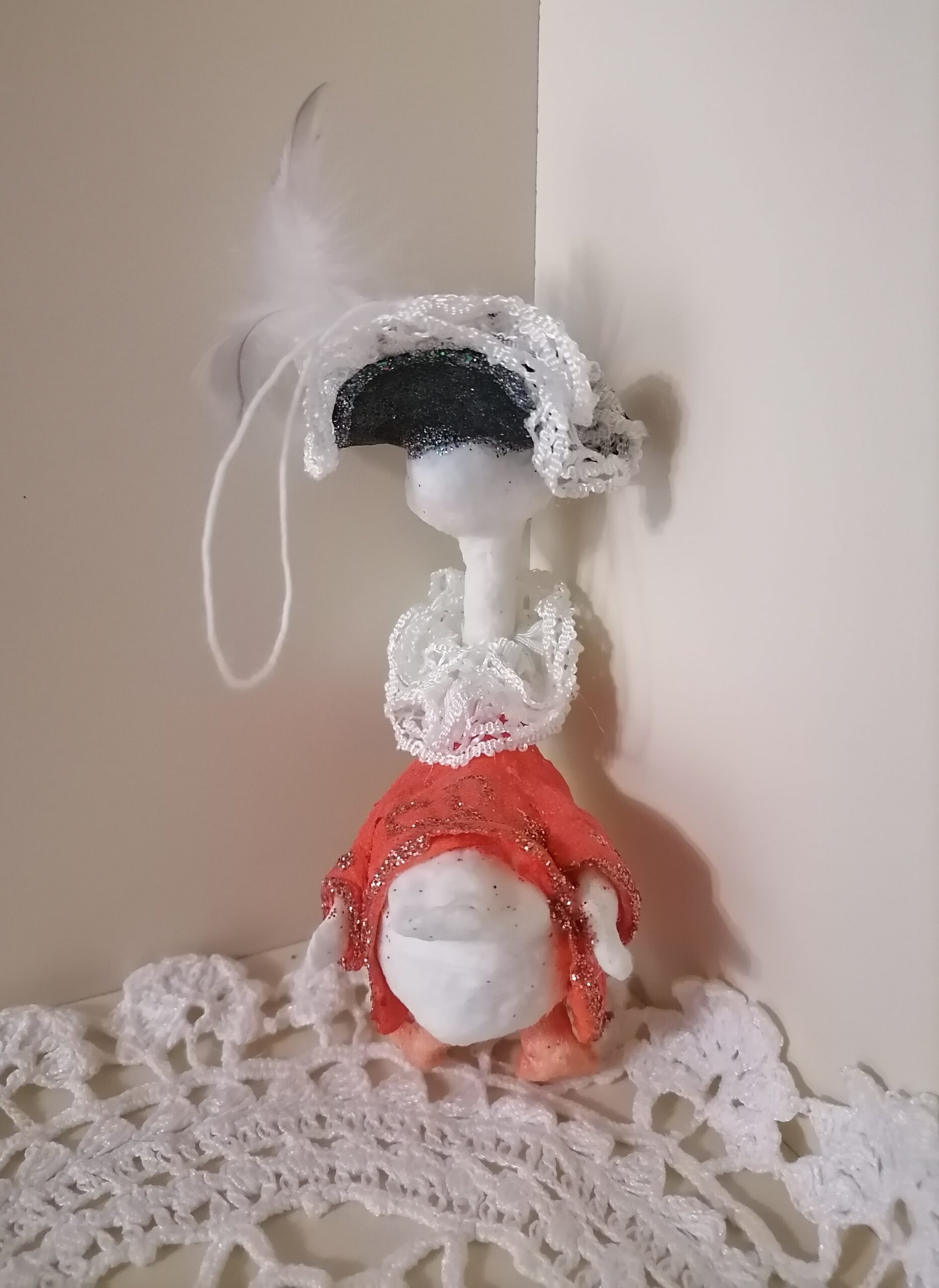 Сделан из ваты на клейстере из крахмала , и на каркасе из проволоки . Окрашен художественными акриловыми красками . Украшен кружевами и перьями . Высота 12 см .
