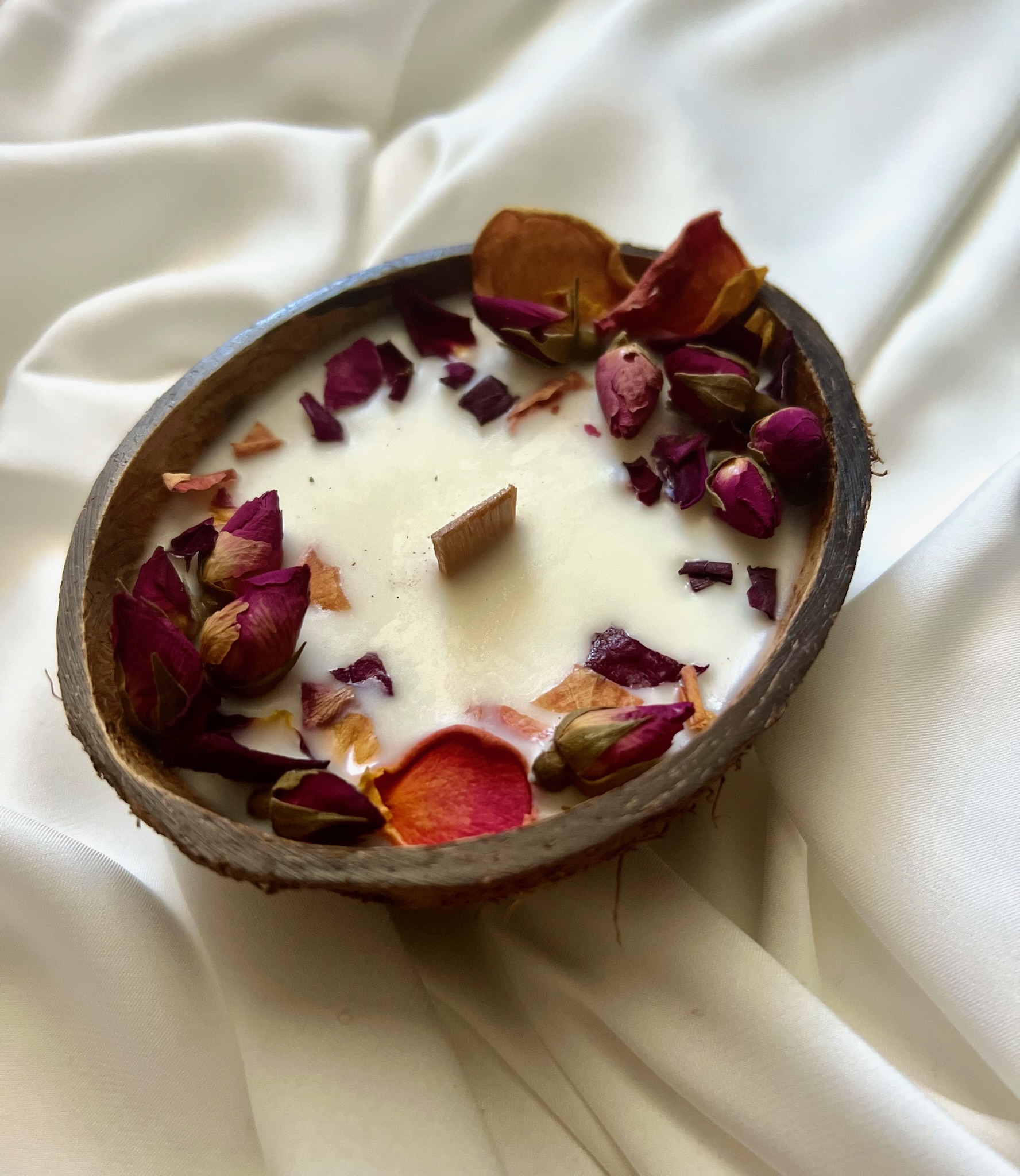 Ароматическая свеча в настоящем кокосе с травами, лепестками и специями. Тёплый свет, мягкий аромат и ощущение уюта с первых минут.