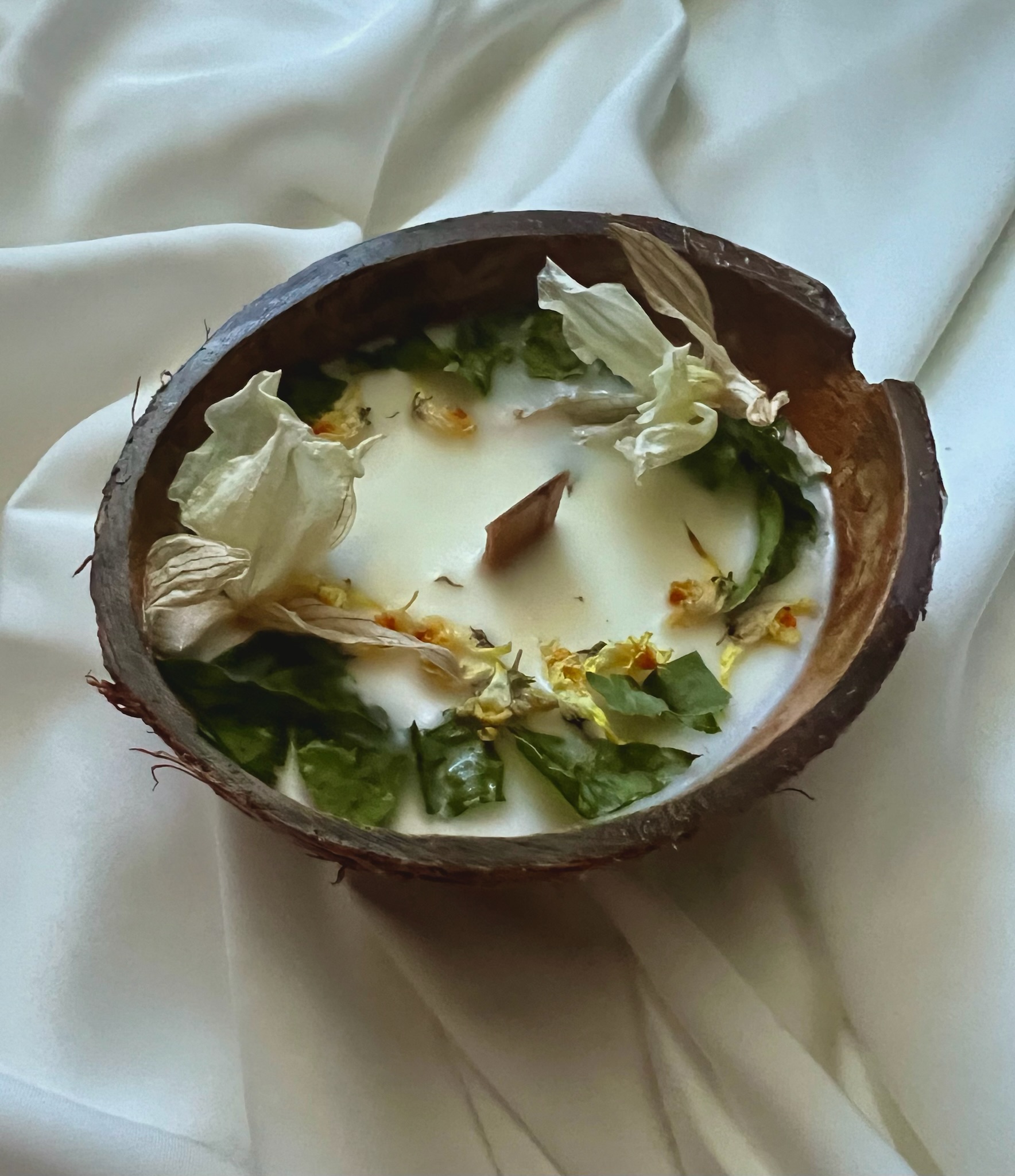 Настоящая кокосовая скорлупа, живые лепестки, травы, специи — все выглядит немного по-разному, и в этом весь кайф. Нет ощущения «с конвейера», наоборот — будто её сделали специально для тебя.