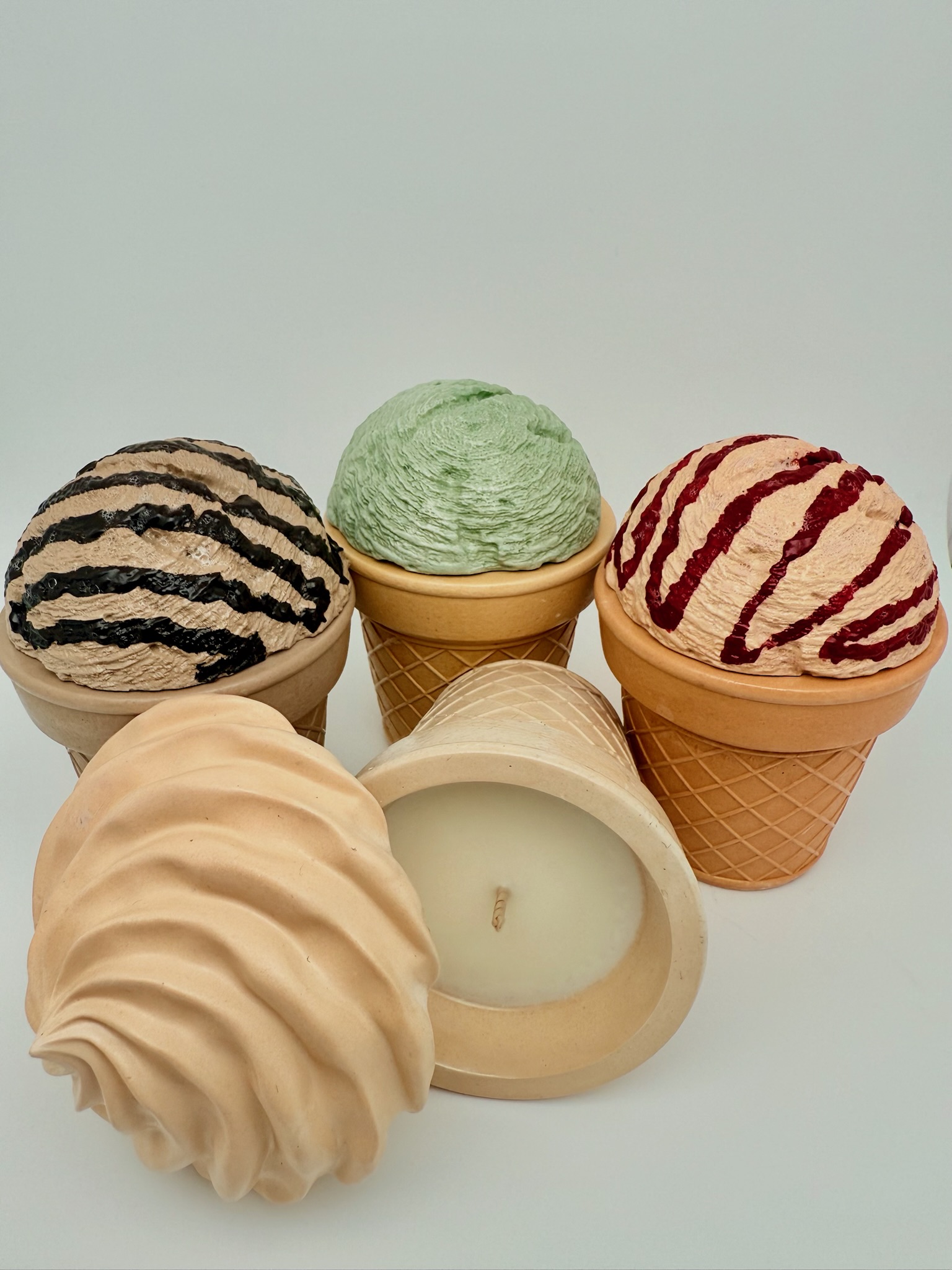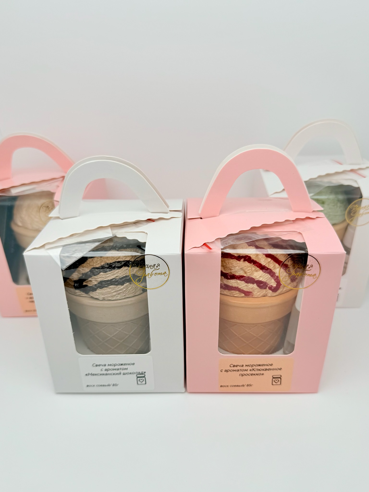 Свеча выглядит как настоящий десерт: аккуратный рожок и “шарик мороженого” с проработанной текстурой и аппетитным видом. Она сразу привлекает внимание и вызывает желание рассмотреть её поближе.