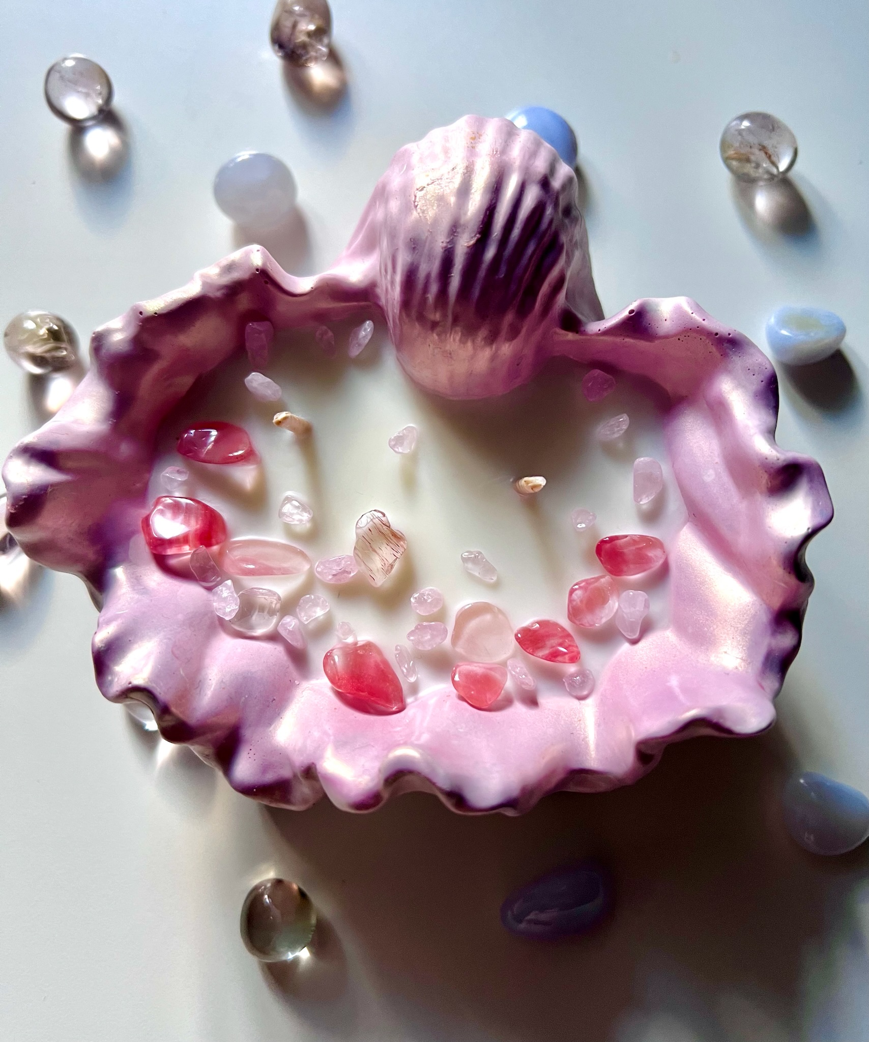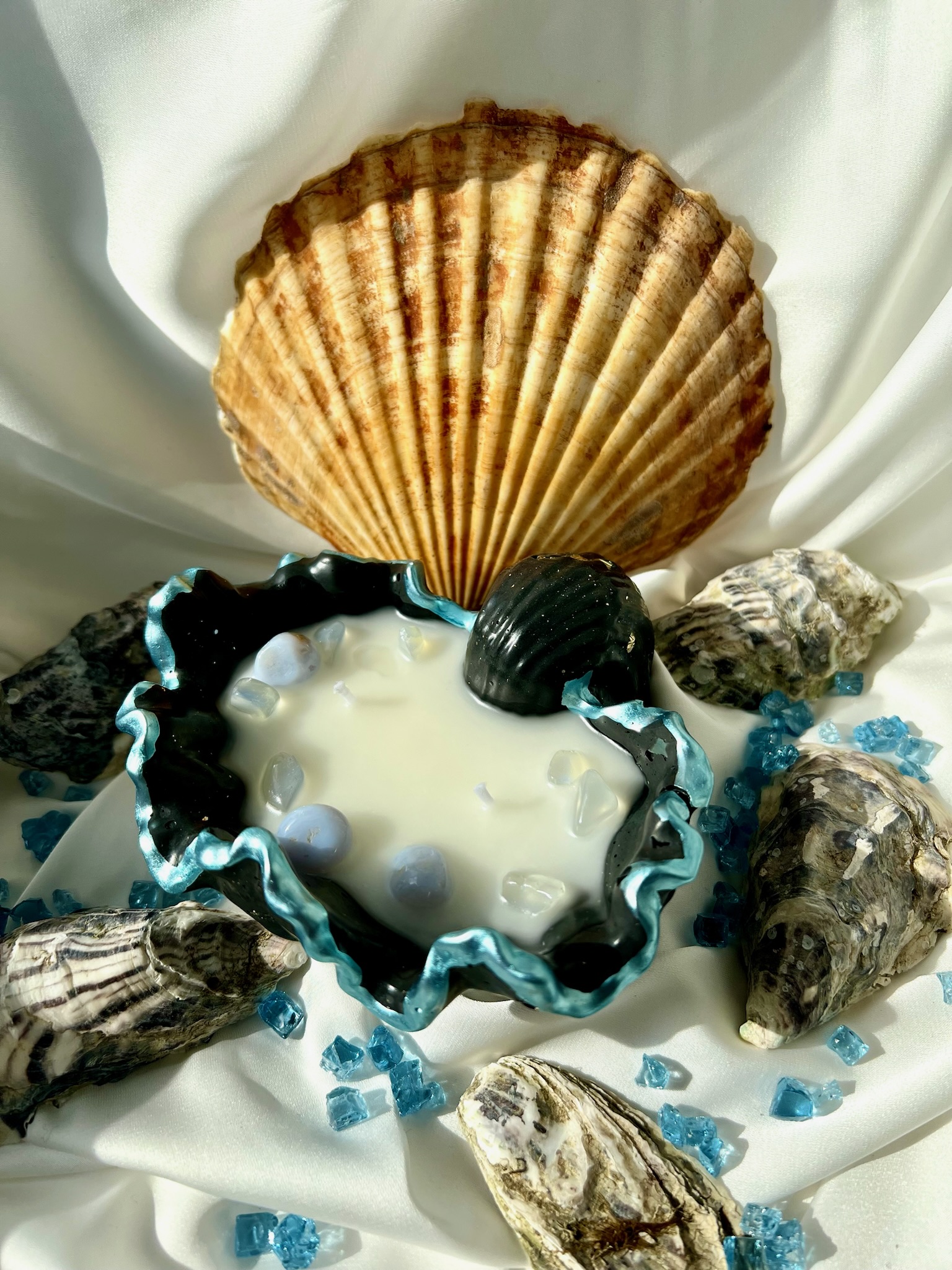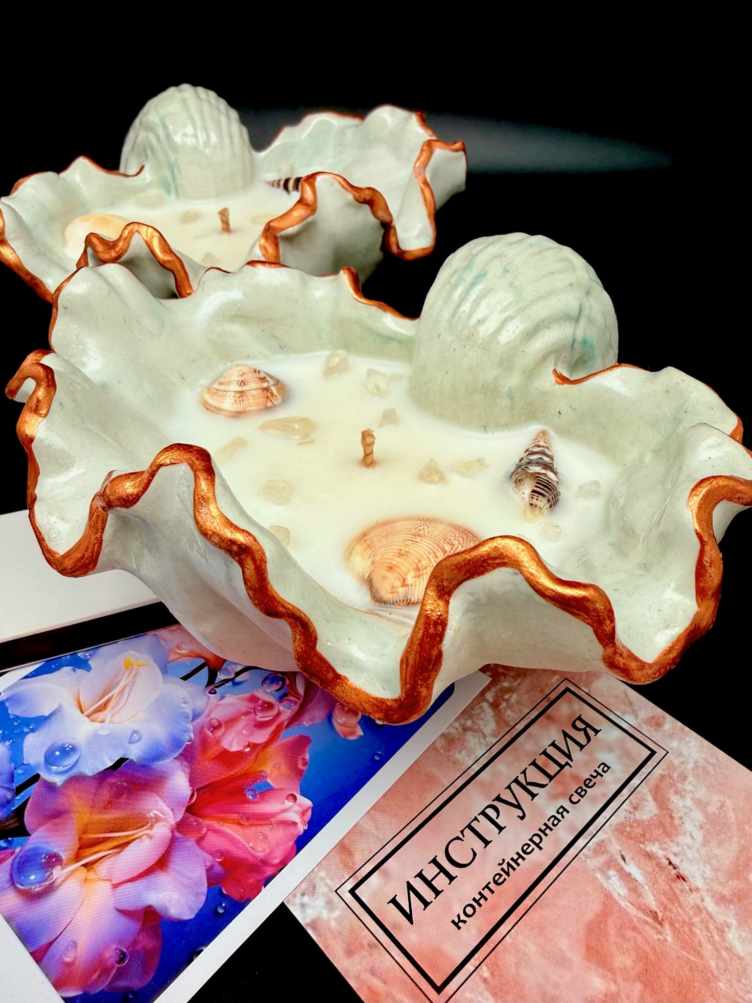 Свеча выполнена в виде раскрытой ракушки с аккуратными декоративными элементами внутри: цветы, текстуры и детали создают ощущение нежности и утончённости. Она выглядит как маленькая композиция, которую хочется рассматривать.