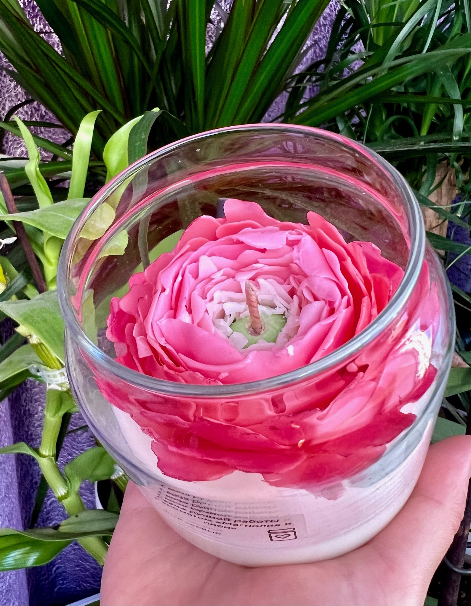 Свеча выглядит так, будто она из сказки — словно волшебный цветок под стеклом. Внутри — аккуратно оформленный бутон, который притягивает взгляд и создаёт ощущение чего-то тёплого и необычного.
