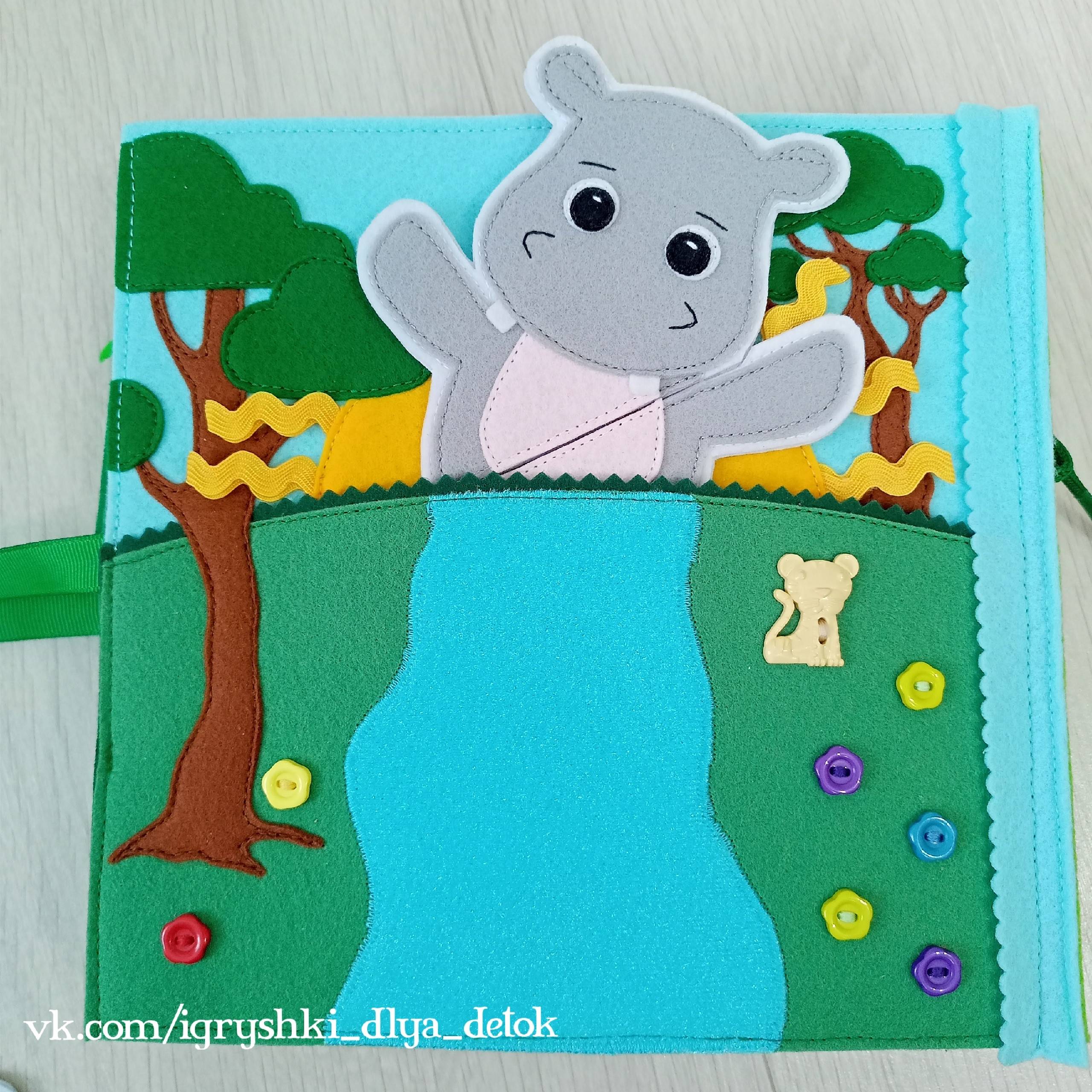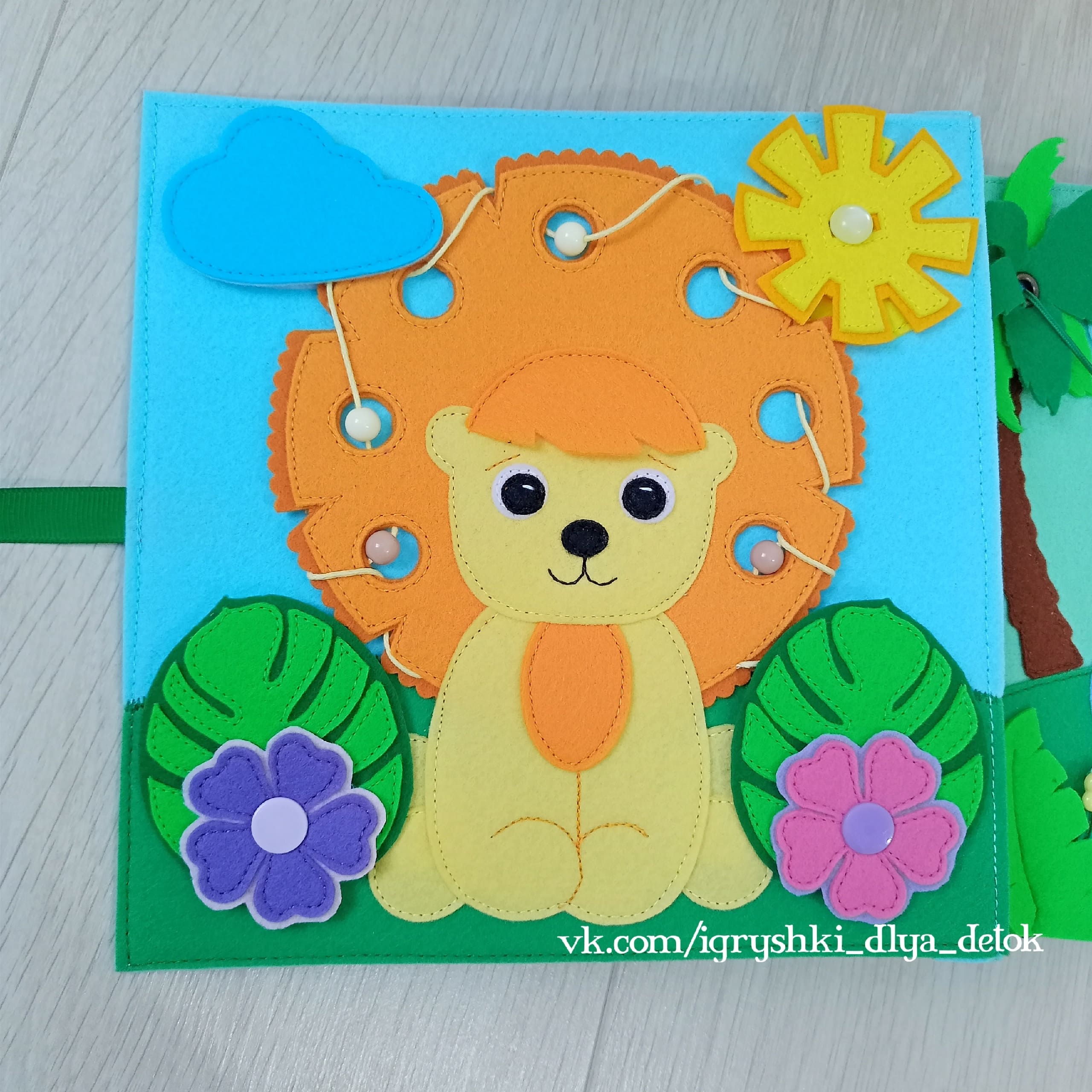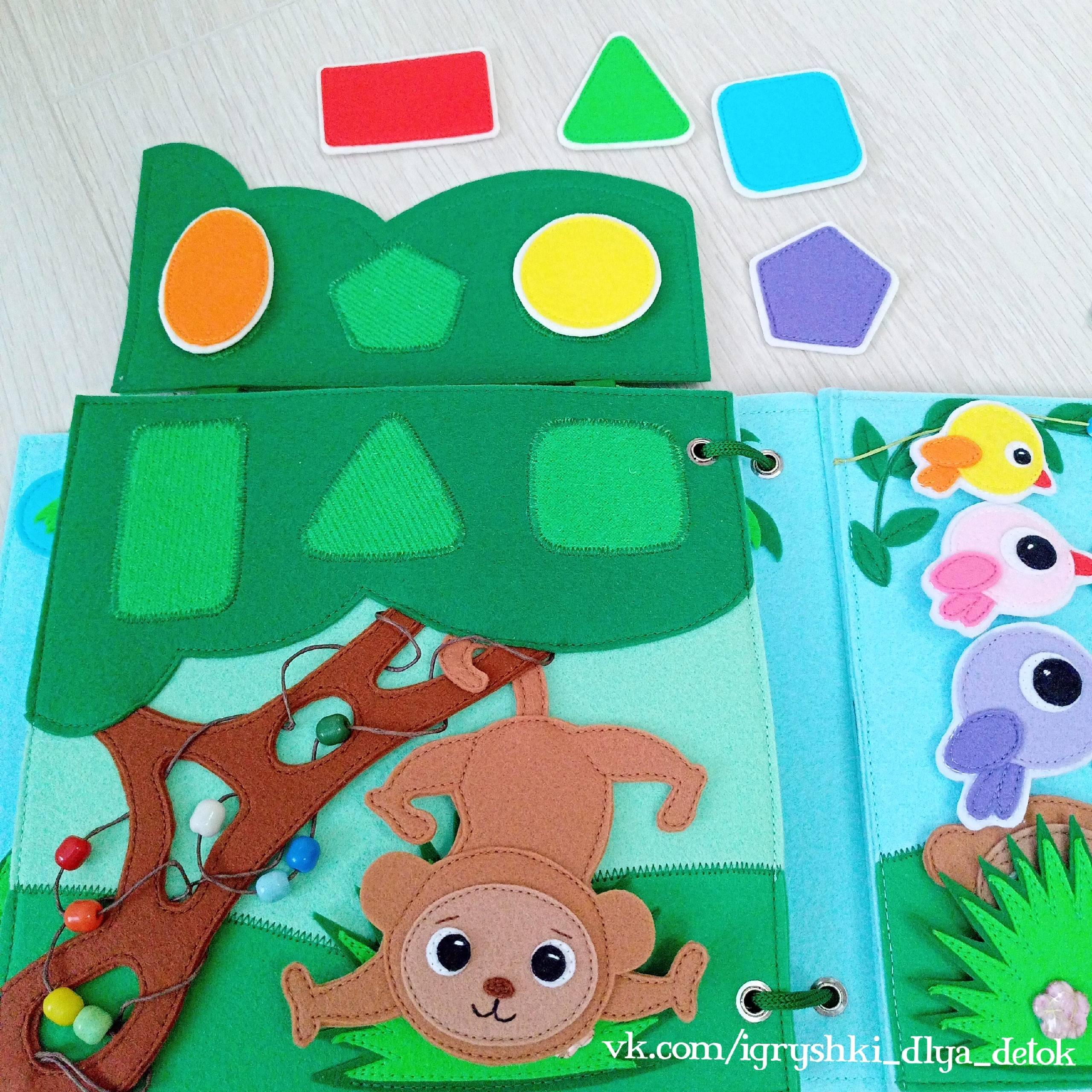 Книга из корейского фетра, собрана на шнуровке, 3 игровых разворота, задняя обложка игровая, передняя обложка декоративная, рассчитана для детей от 1 года, размер 20*20 см.