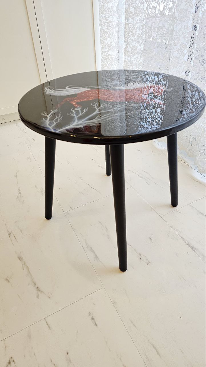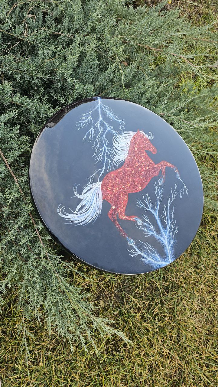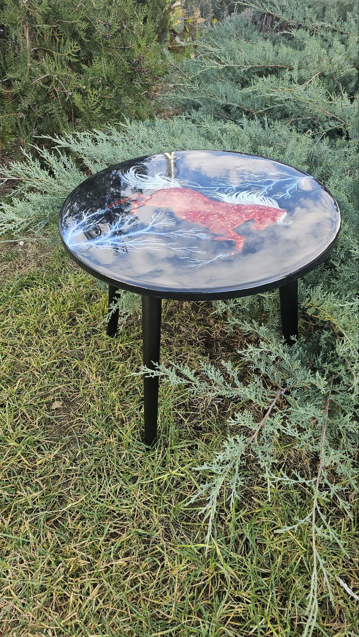 Продаётся стильный круглый журнальный столик » Рыжий конь» с уникальным дизайном на столешнице, конь выполнен в 3Д-технике. Молнии, хвост и грива в темноте светятся. Материалы : мдф, металлическая и стеклянная крошка, акрил, люминофор, ювелирная смола. Он станет отличным дополнением вашего стильного интерьера . Черное основание придаёт изделию элегантный вид, а размеры диаметром 50см делают его идеальным для небольших помещений. Высота столика составляет 47 см.