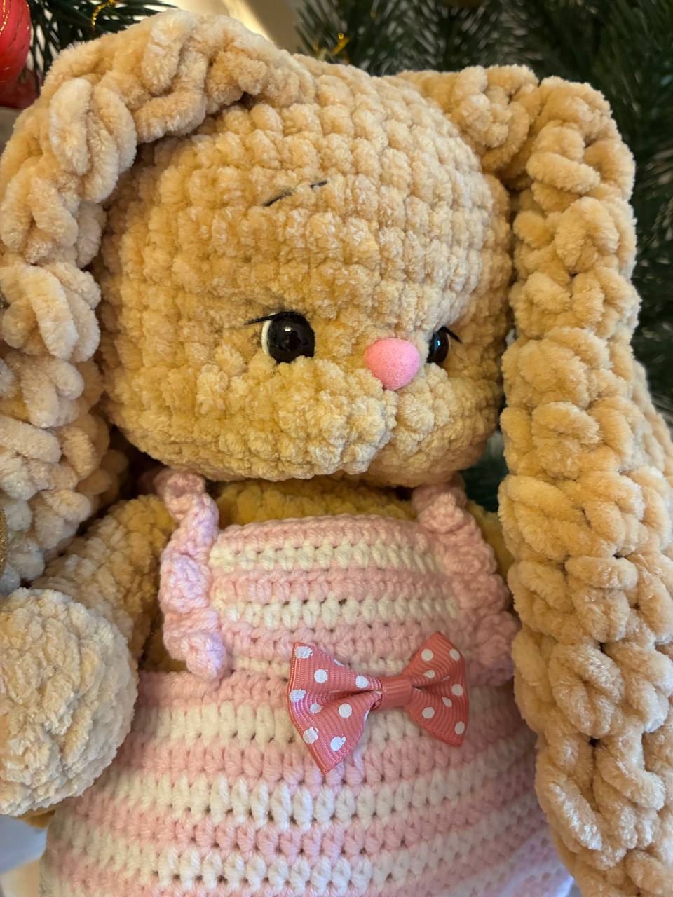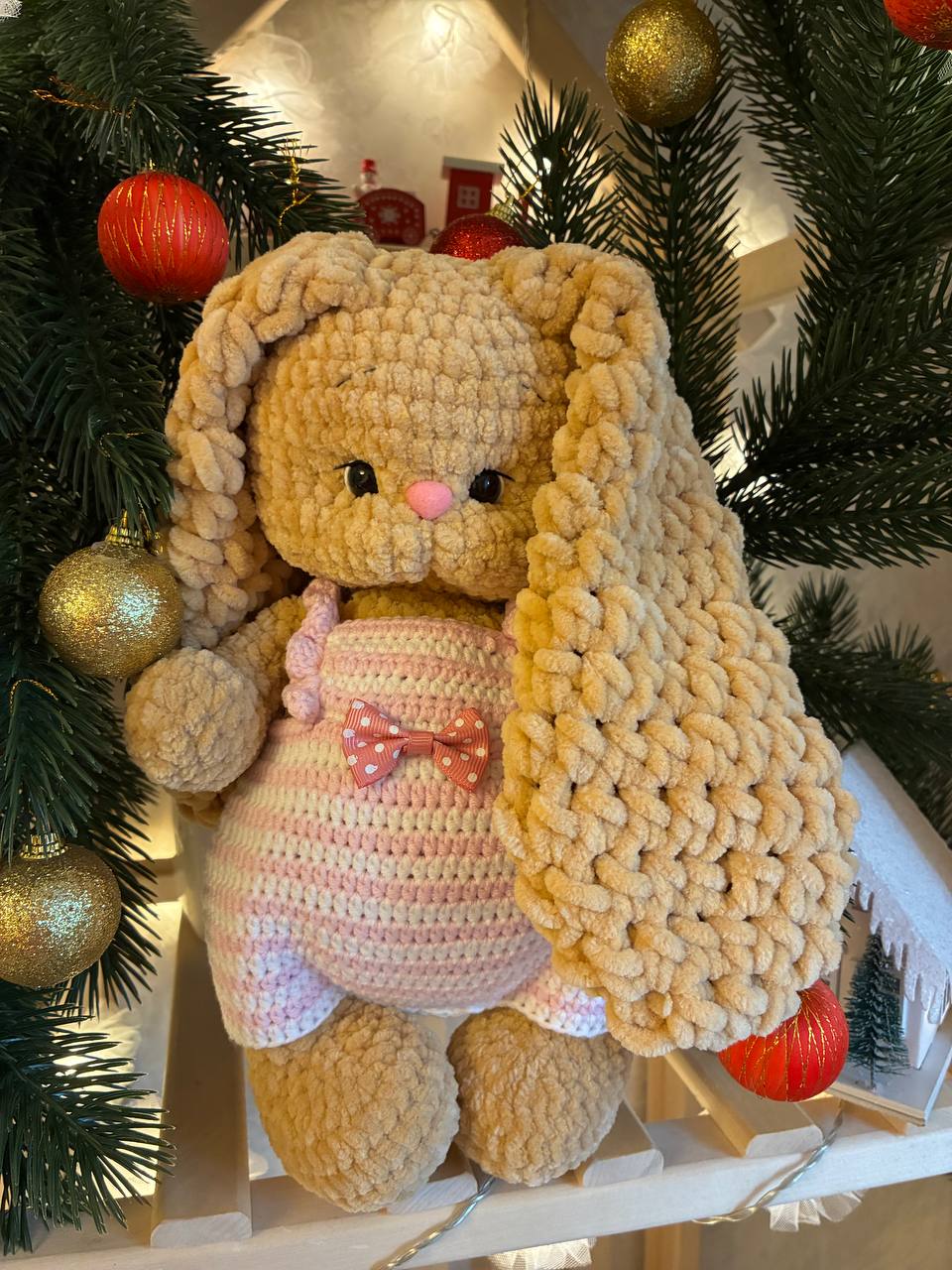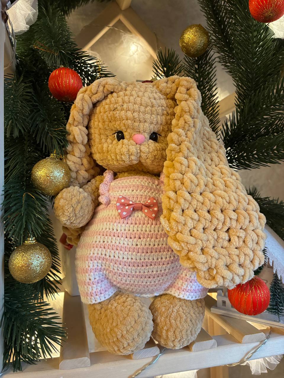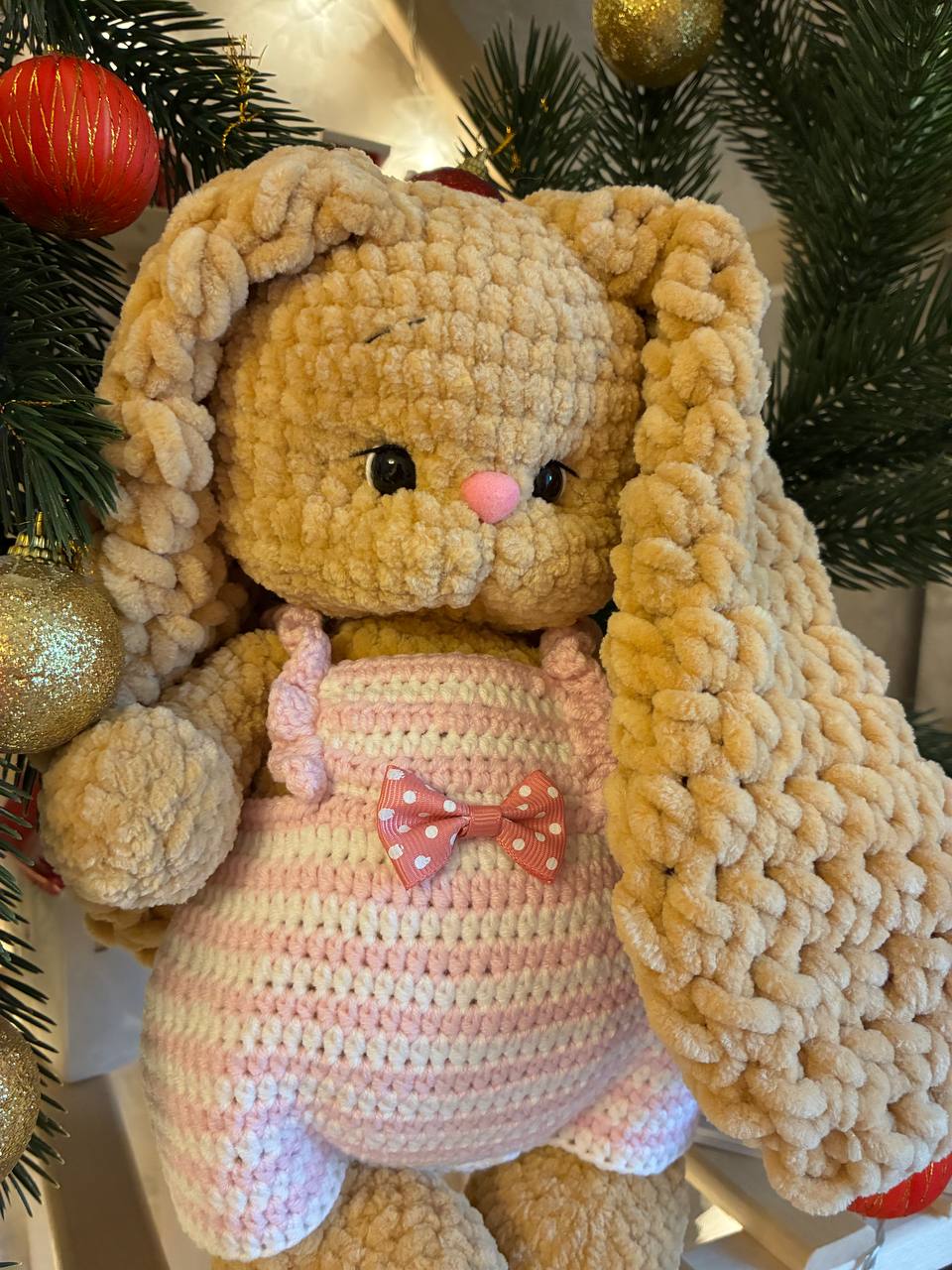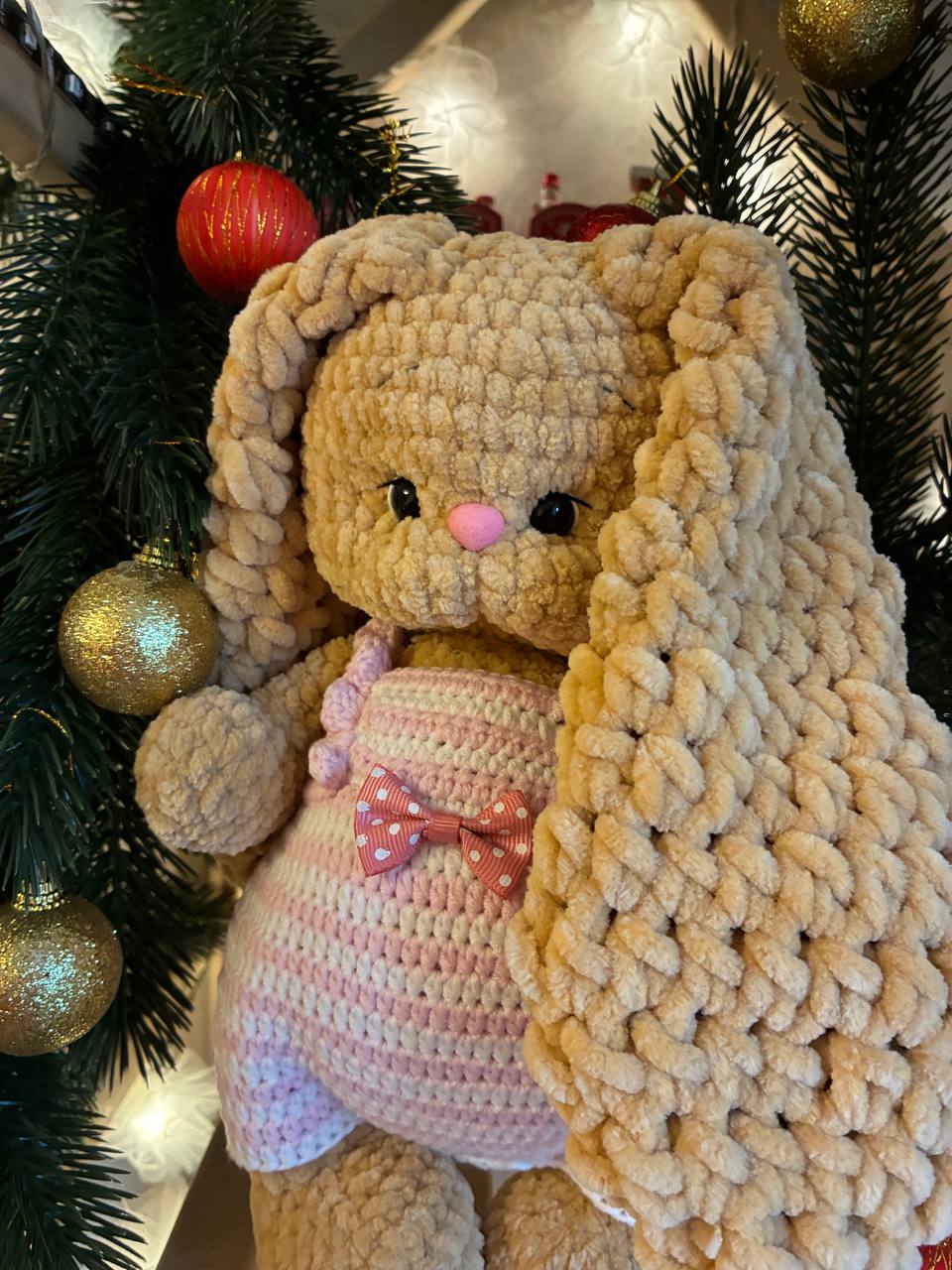 Материалы гипоаллергенны и безопасны даже для малышей: плюшевая пряжа, наполнитель-синтепон, комбинезон связан из полухлопковой пряжи