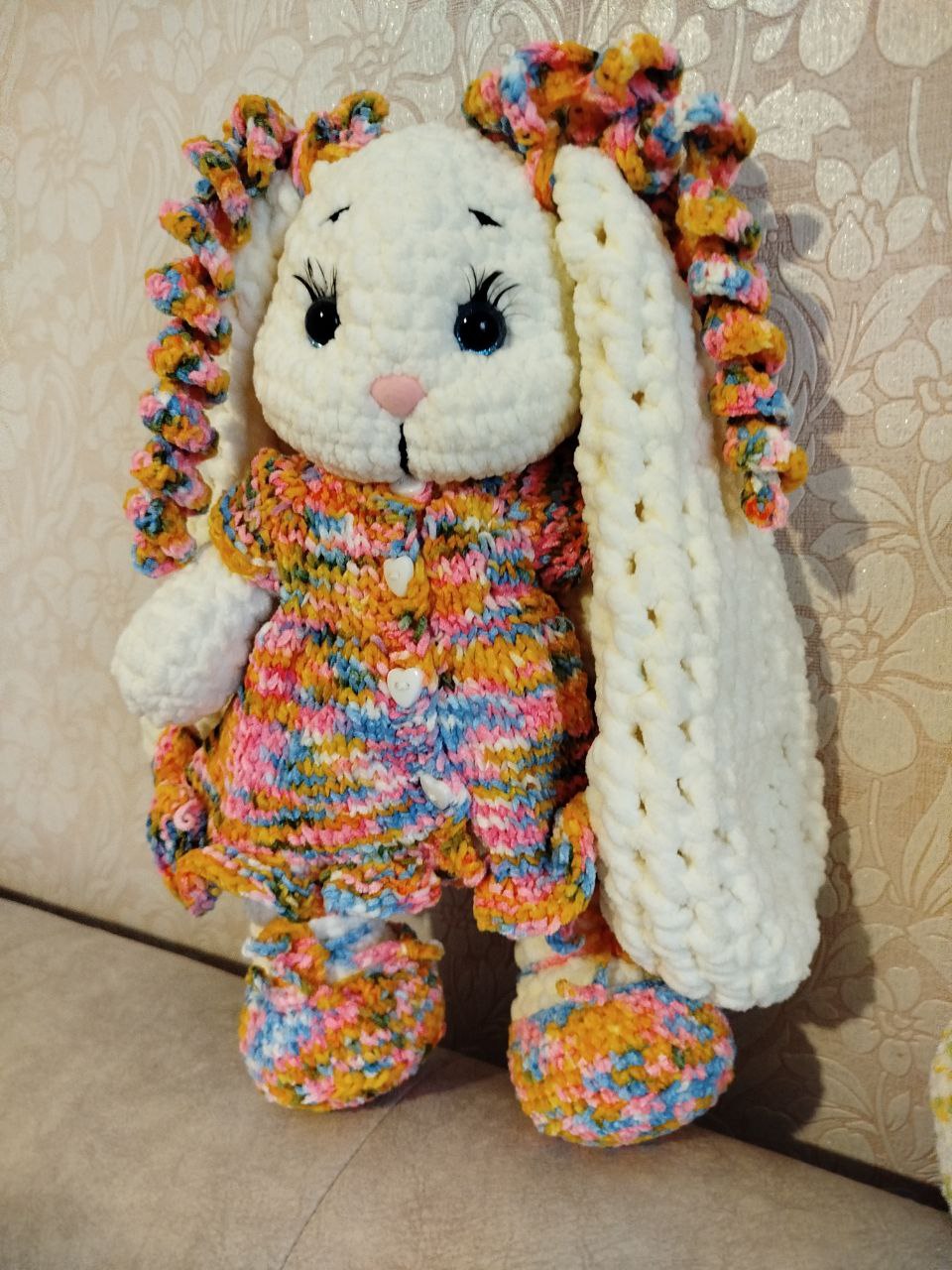 Представляем очаровательную зайку, выполненную вручную из мягкой плюшевой пряжи.