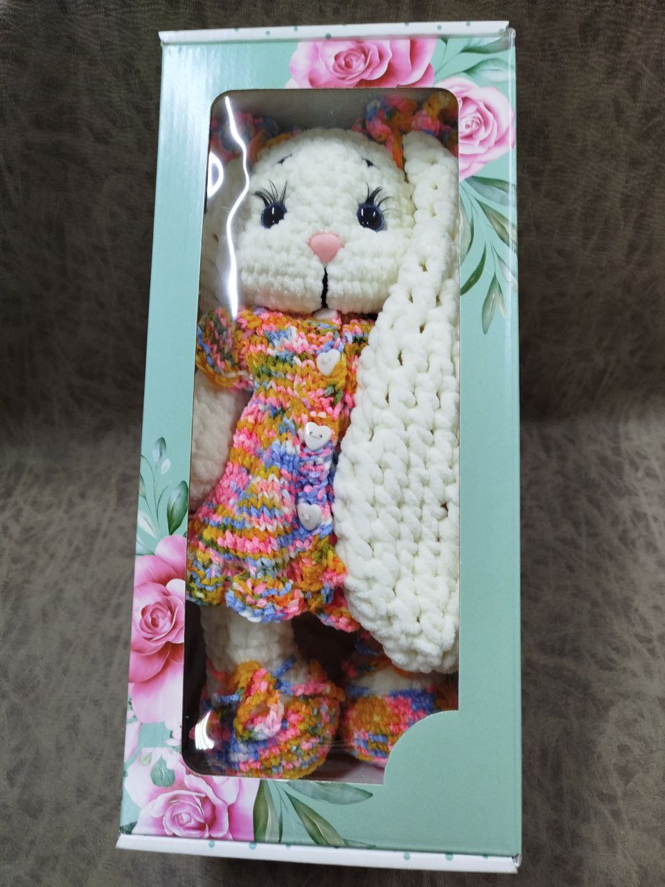 Преимущества:Ручная работа: каждая зайка уникальна, с небольшими отличиями в деталях вязки.
