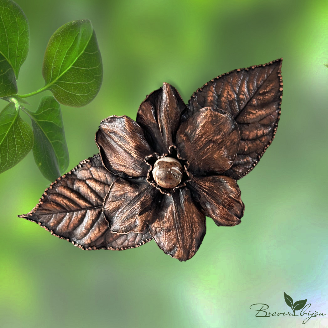 Эта заколка — автомат изготовлена из живых листочков краснолистной сливы Писсарди и маленького цветка нарцисса, омедненных методом гальванопластики. Эта техника дает возможность передать до мельчайших деталей природную текстуру , каждую прожилку и изгиб. Цветок украшен бусиной натурального камня Австралийская зебра. Изготовленная вручную, заколка станет идеальным аксессуаром для обладательниц длинных волос.