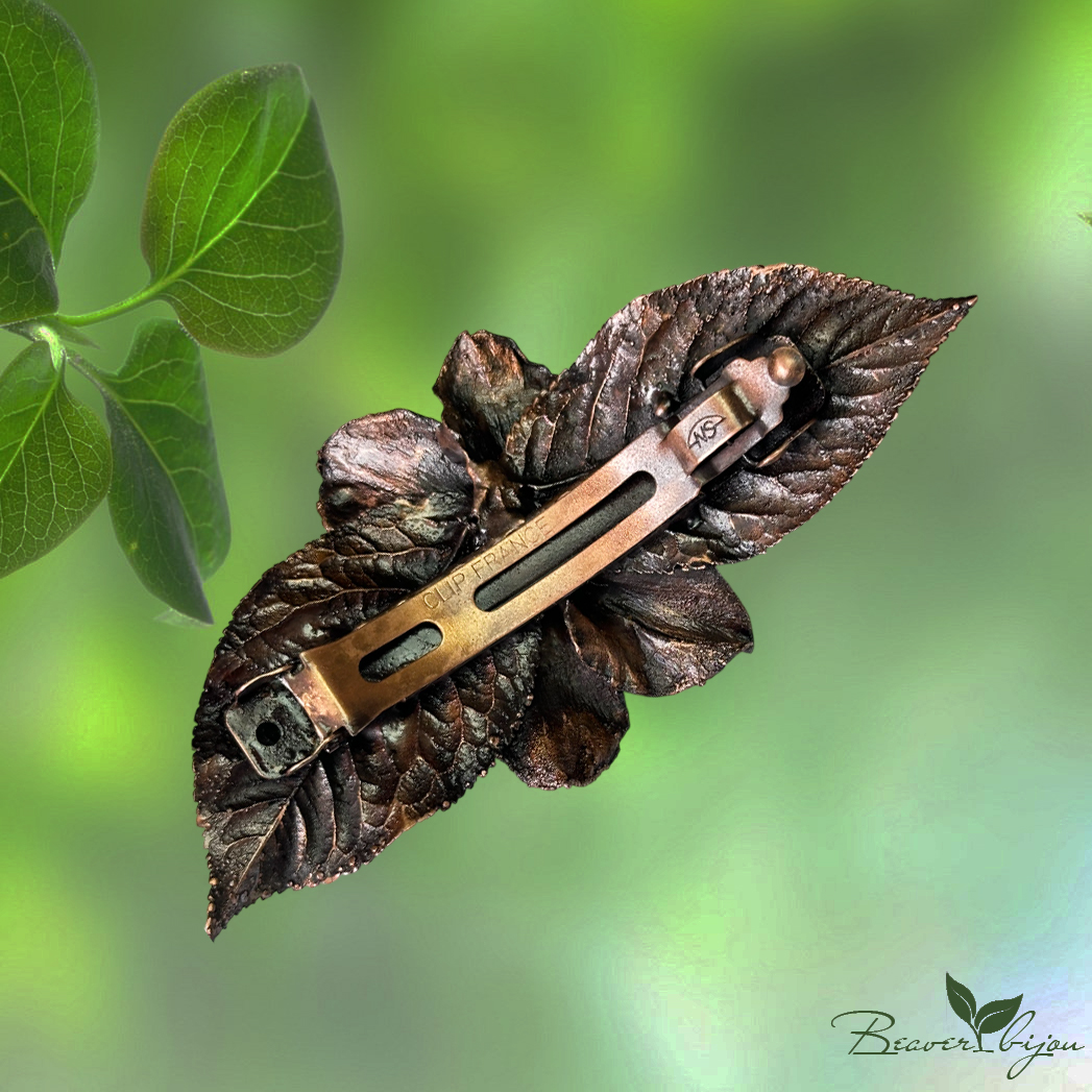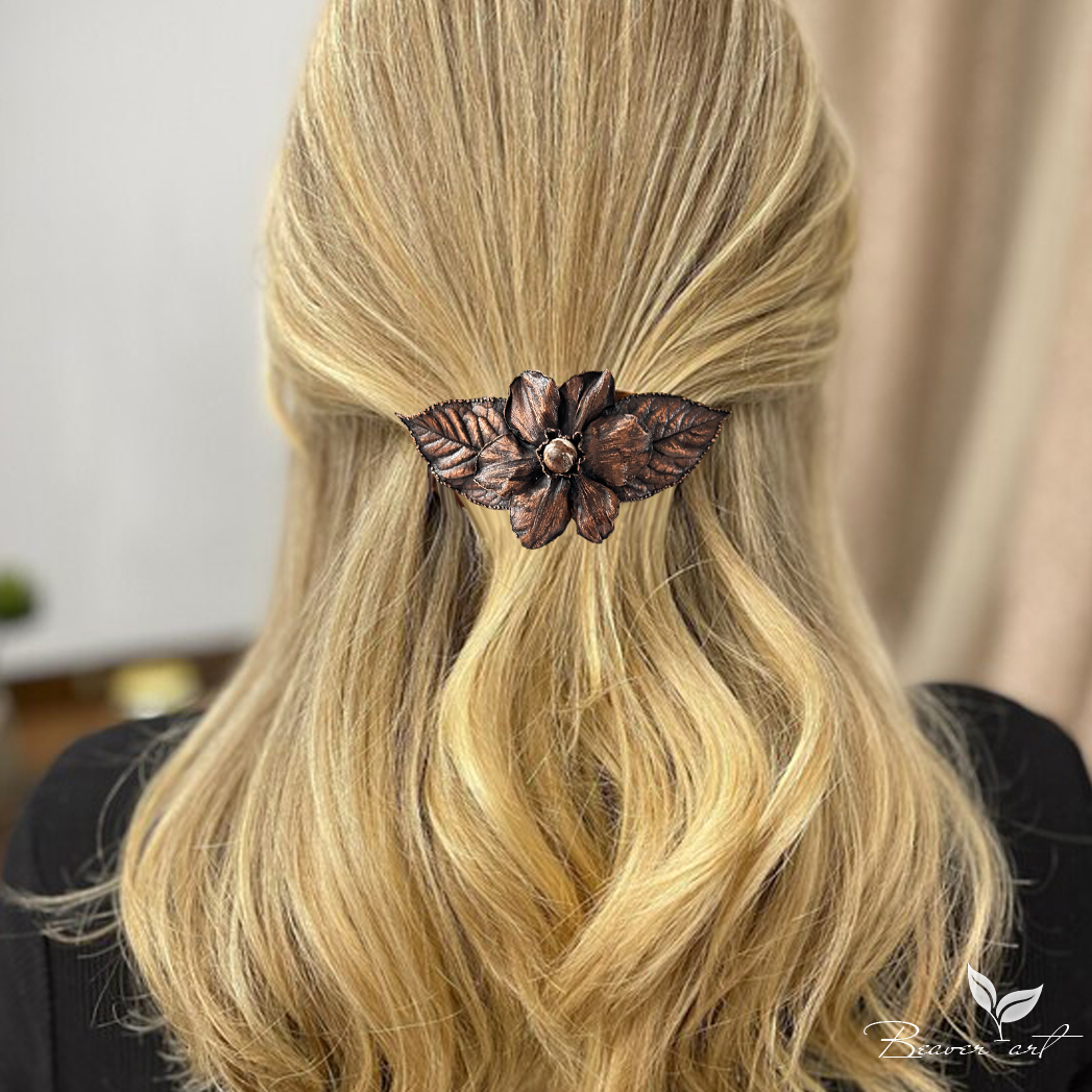 Заколка-автомат для волос из омедненных листиков дикой сливы и цветка нарцисса