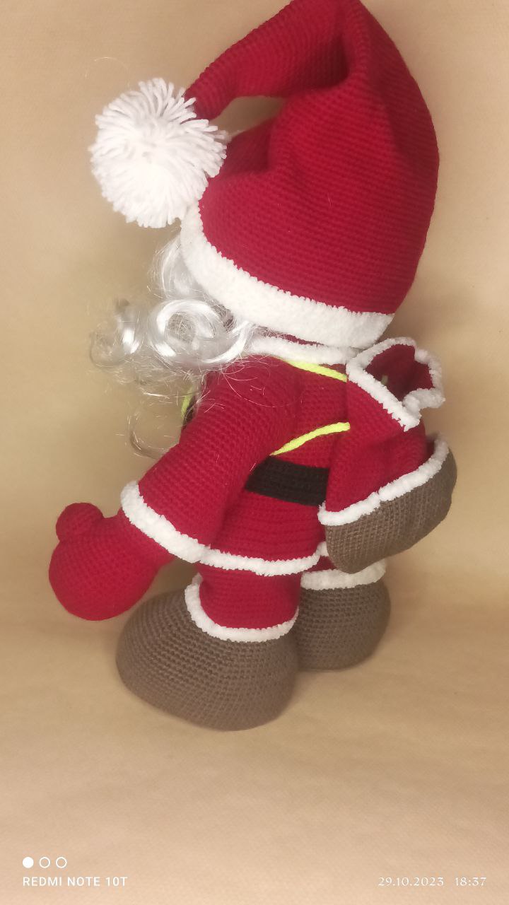 Крутой новогодний дедушка, имеет за спиной мешочек для сладостей,колпачок снимается, может сам стоять. Ростом дедуля 45 см, имеет проволочный каркас с помощью которого может держать ручки в определенном положении. Связан из акриловой пряжи, наполнен синтепухом. Зрачки глазок приклеены из-за этого не рекомендуется для игры детям до 3х лет. Борода из искусственных волос, тоже на клею. Сама одежда не снимается.