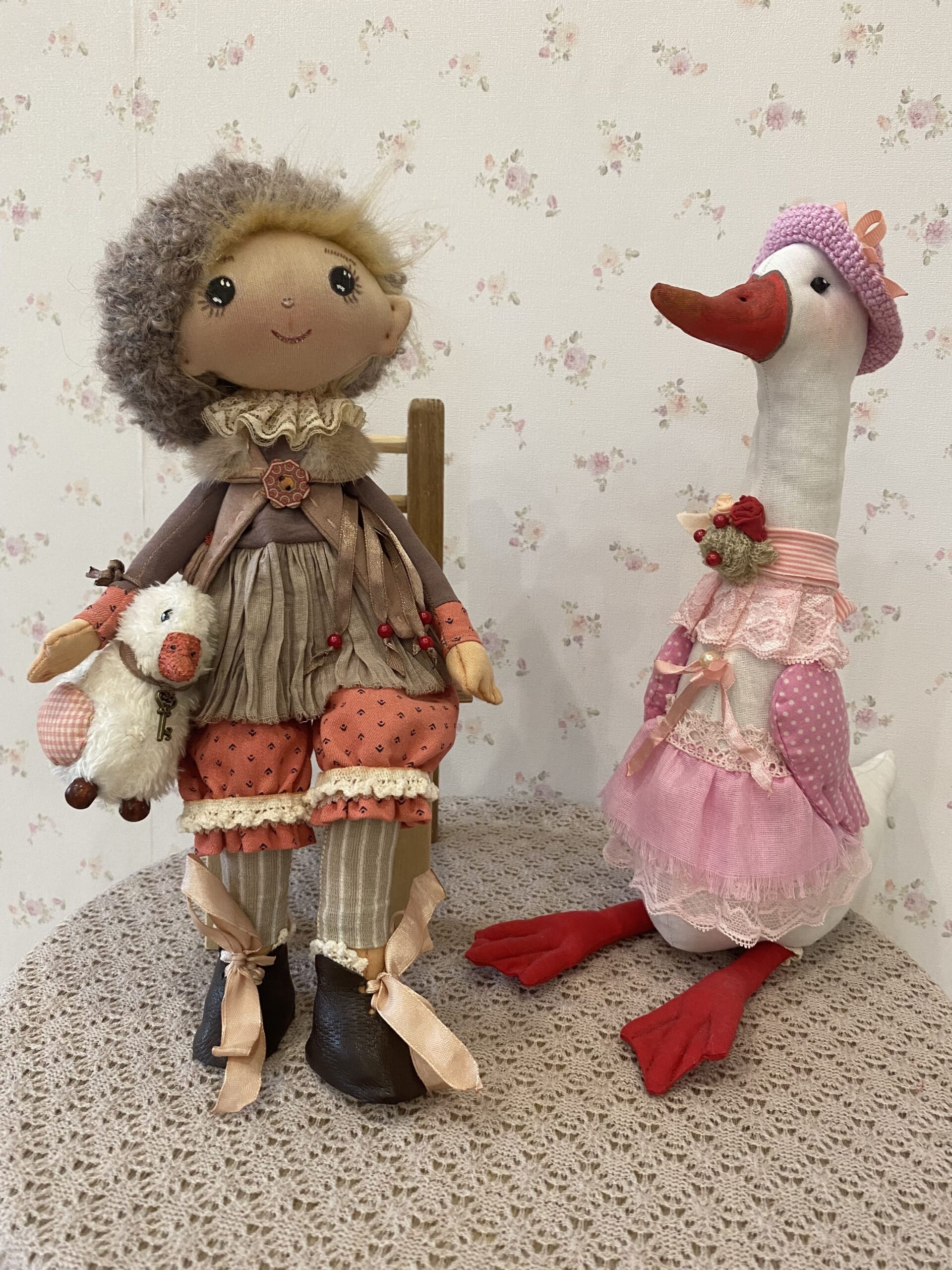Интерьерная куколка с уточкой!Полностью ручная работа. Изготовлена из натуральных тканей, обувь из кожи. Рост 35см.Такая игрушка дает возможность окунуться в сказку! Идеально подходит в качестве душевного подарка как взрослому так и ребенку. Украсит любой интерьер , придаст изюминку, неповторимость и уют!Оригинальный гусь охраняет своего малыша!