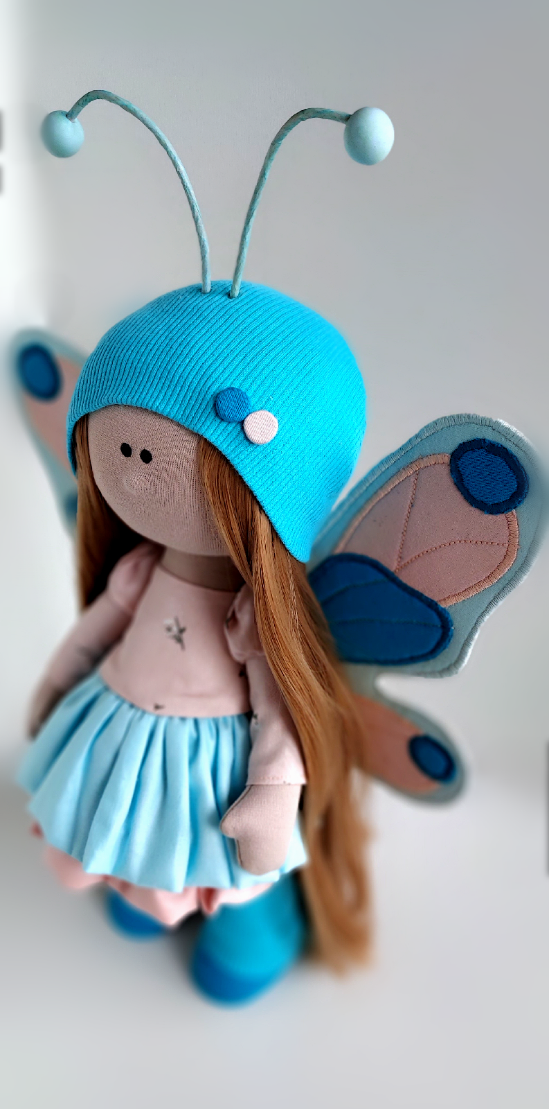 Бирюзовая шапочка с забавными «усиками» и большие крылышки бабочки с голубыми и розовыми вставками создают образ сказочного персонажа. Такая кукла станет милым декором детской комнаты, оригинальным подарком на любой праздник и любимой игрушкой для нежных обнимашек.