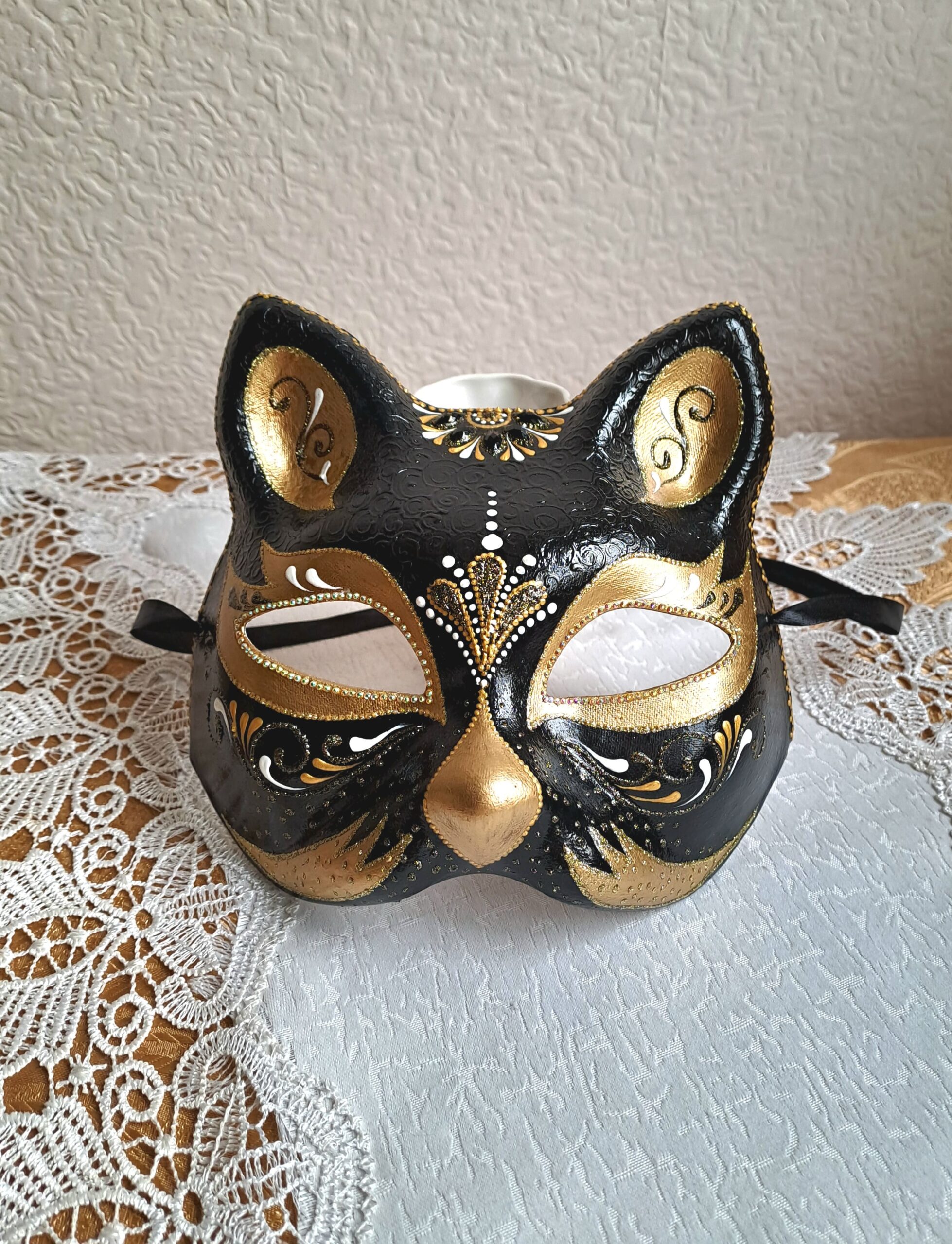 Карнавальная маска кошки с декором в технике точечной росписи.