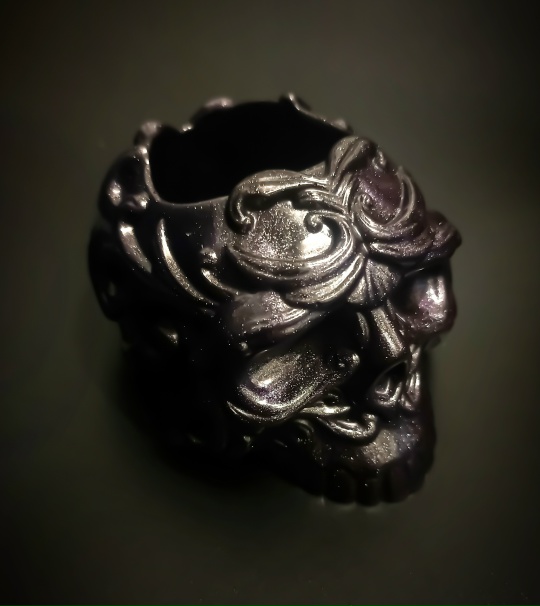 Это не просто подставка. Это артефакт, покрытый тайными знаками. Весь череп — от макушки до челюсти — оплетён витиеватыми выпуклыми узорами, которые можно бесконечно разглядывать и трогать. Они похожи на древние письмена, на застывшие заклинания, на вязь, которую вырезал безымянный мастер много веков назад.