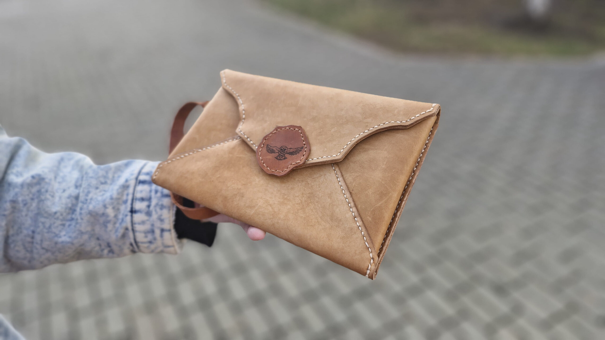 По желанию можно сделать надпись на конверте методом пирографии. Возможно исполнить без ремня в в виде конверта или с ремнем в виде сумки. Есть два варианта крепления ремня: короткий на одну руку или плечевой длиной 110 см. Возможно исполнение в других цветах.