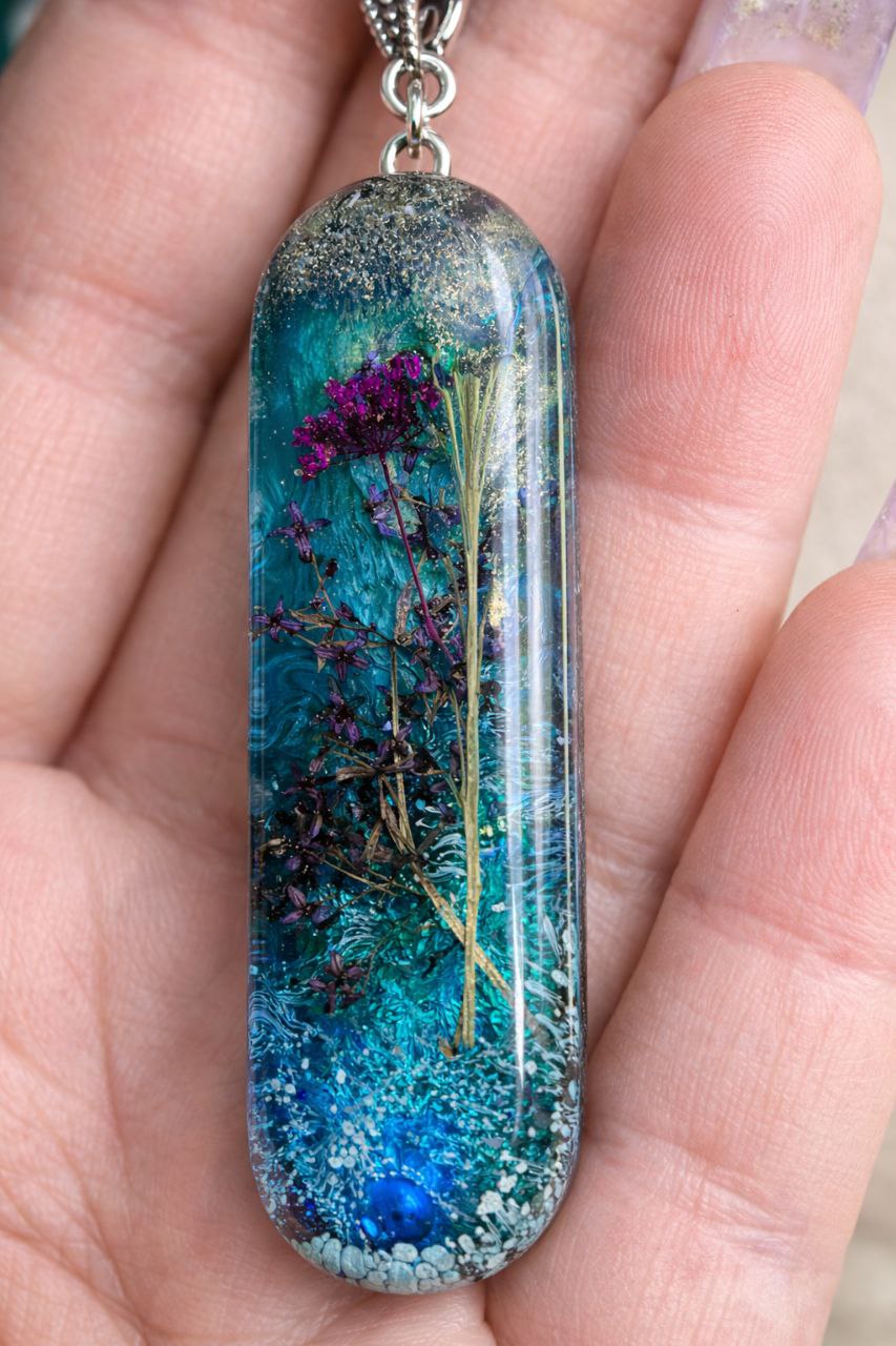 Каждый кулон из этой серии — это крошечный портал в вечное лето. Мы создали уникальные авторские кулоны из эпоксидной смолы, внутри которых бережно сохранены настоящие микро-сады. Тонкие веточки, объемные бутоны, фактурный мох и мерцающие акценты застыли в прозрачной ювелирной смоле, образуя неповторимые пейзажи.