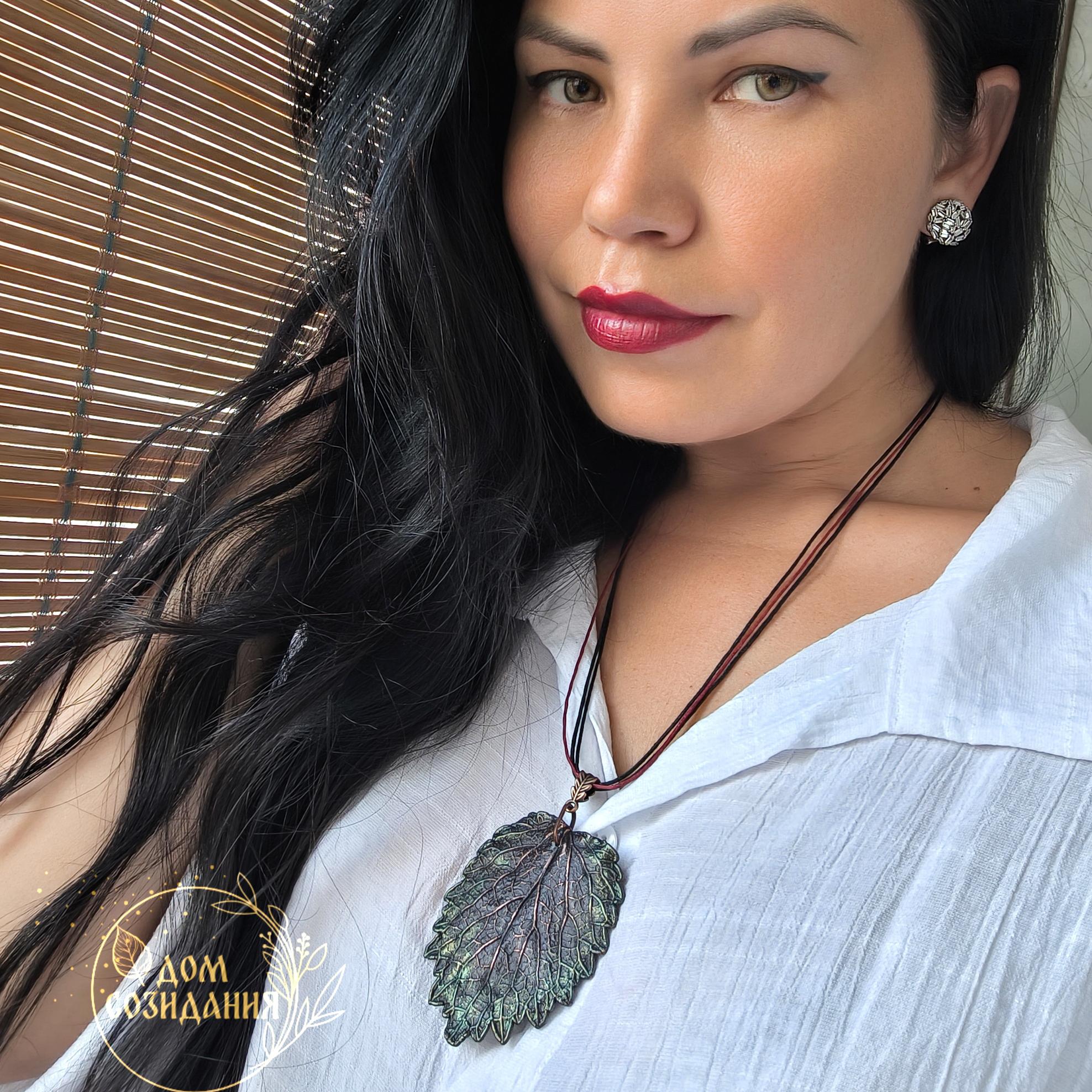 Изысканное колье, центральным элементом которого служит лист куста Яснотки, выполненный в технике гальванопластика.Поверхность листа переливается оттенками коричневого, медного и тёмно-шоколадного, а сияющая патина в зелёных тонах придаёт украшению загадочность и глубину. Фактурные прожилки листа сохранены с поразительной точностью — кажется, будто перед вами не изделие,а настоящий лист, бережно заключённый в металл. Вощёный шнур, на котором держится подвеска, сочетает чёрный и красный цвета, создавая выразительный контраст с тёплыми тонами листа. Металлические звенья цепочки и застёжка гармонично дополняют композицию, превращая колье в маленькое произведение искусства, способное пробудить воображение и напомнить о красоте природы.