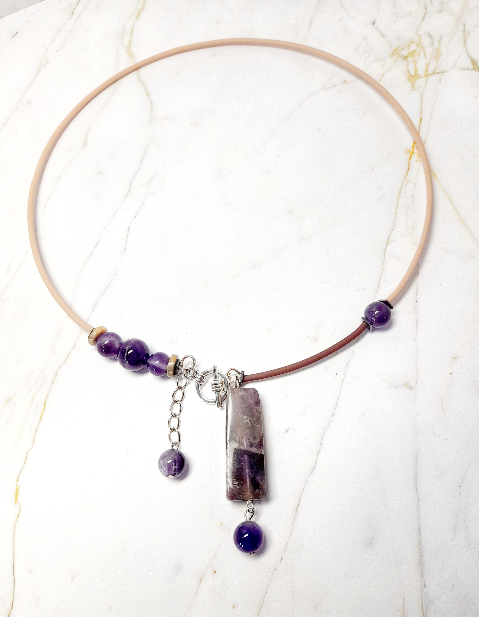 Уникальное колье-фермуар с натуральным аметистом, яшмой и гематитом изготовлено на мемори-проволоке с натуральным каучуком в бежево — коричневых тонах. Застегивается впереди на декоративный замочек-тогл. Можно носить не застегивая замочек-тогл, он будет выглядеть как декоративная деталь.