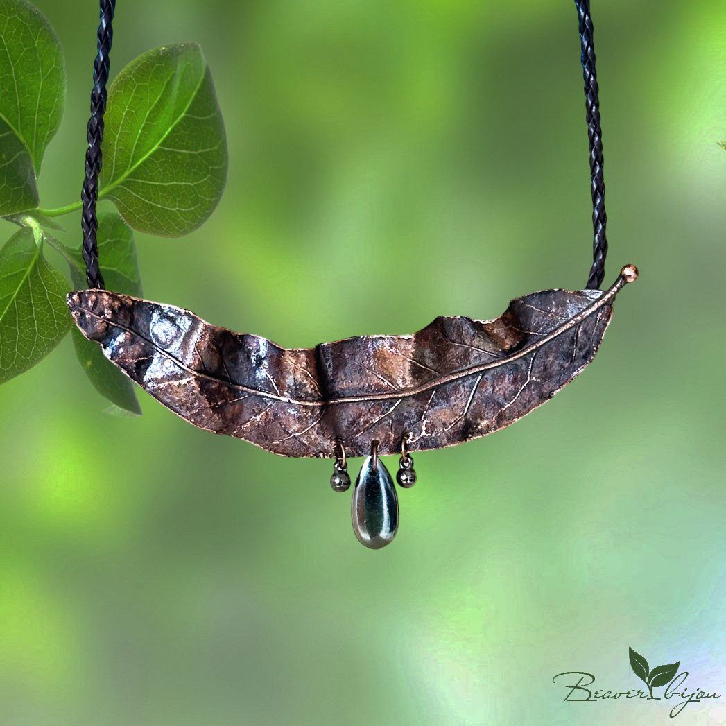 Колье Олива изготовлено из настоящего листика дикой оливы, омедненного методом гальванопластики. Украшено гематитом.