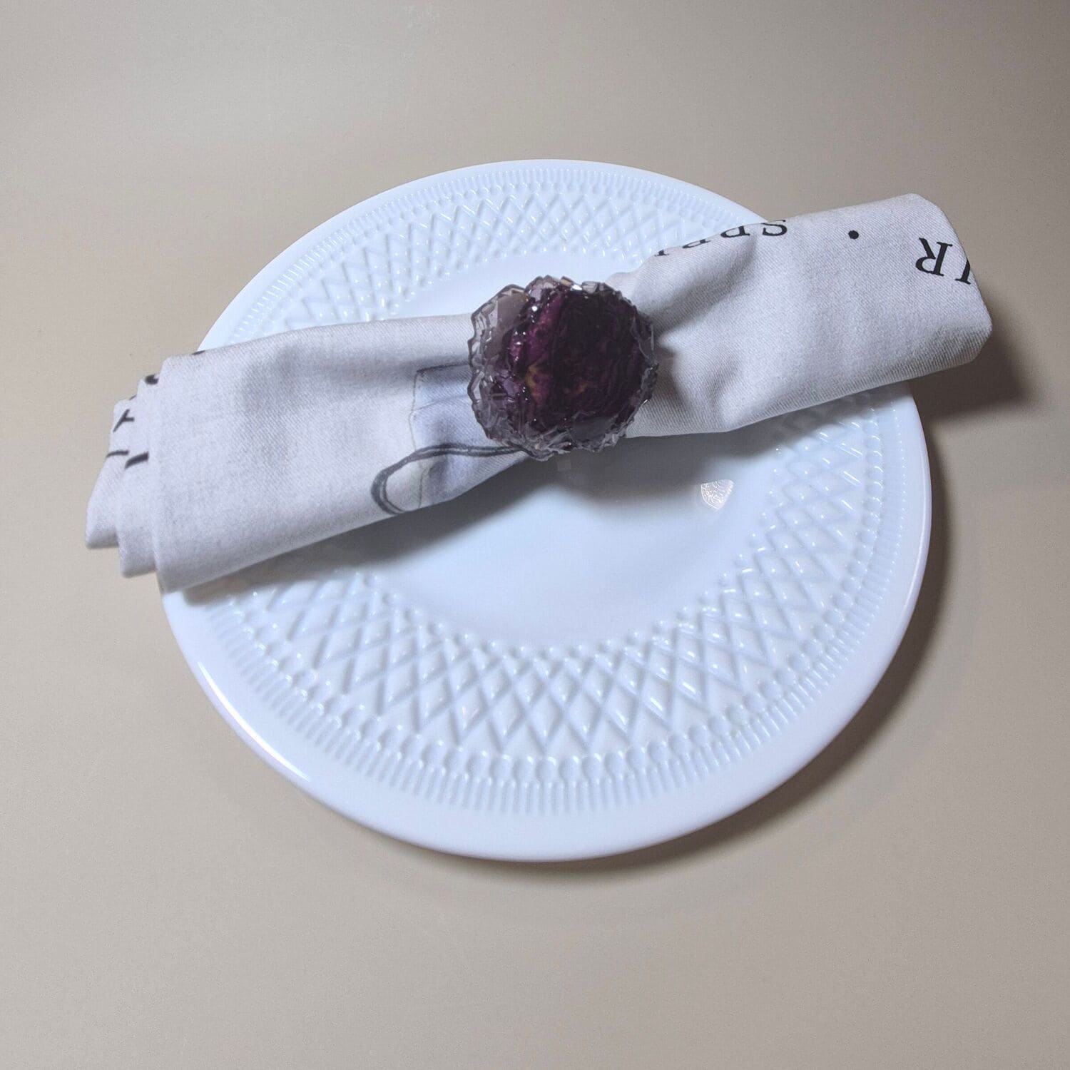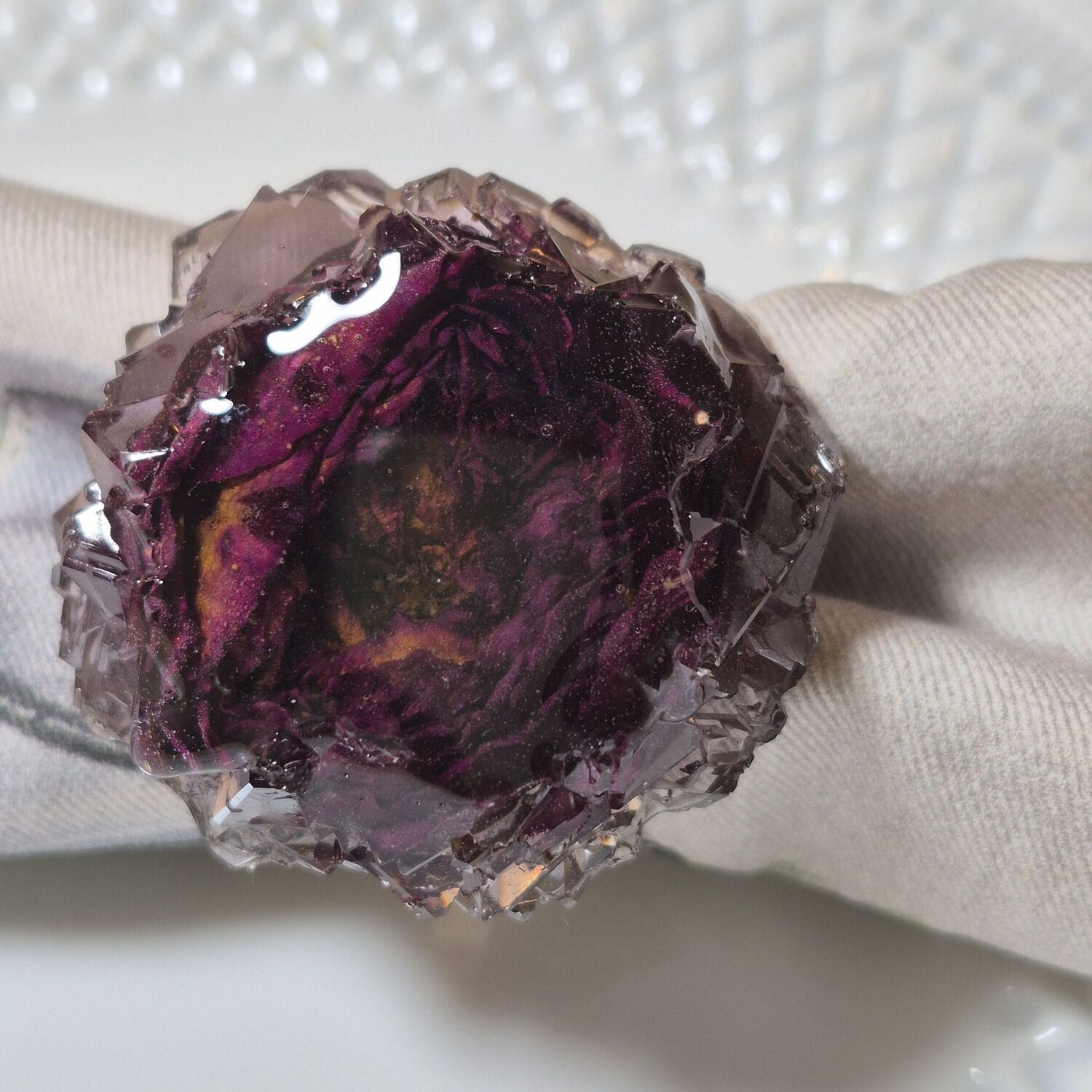 Изящные кольца для салфеток станут прекрасным дополнением к любому праздничному столу. Основа каждого кольца выполнена из высококачественного металла золотистого цвета, тонкой и аккуратной работы. Украшения из прозрачной эпоксидной смолы с засушенными цветами,напоминающие друзы благородных камней, придает кольцам неповторимый шарм и элегантность. Надежное крепление гарантирует удобство использования.
