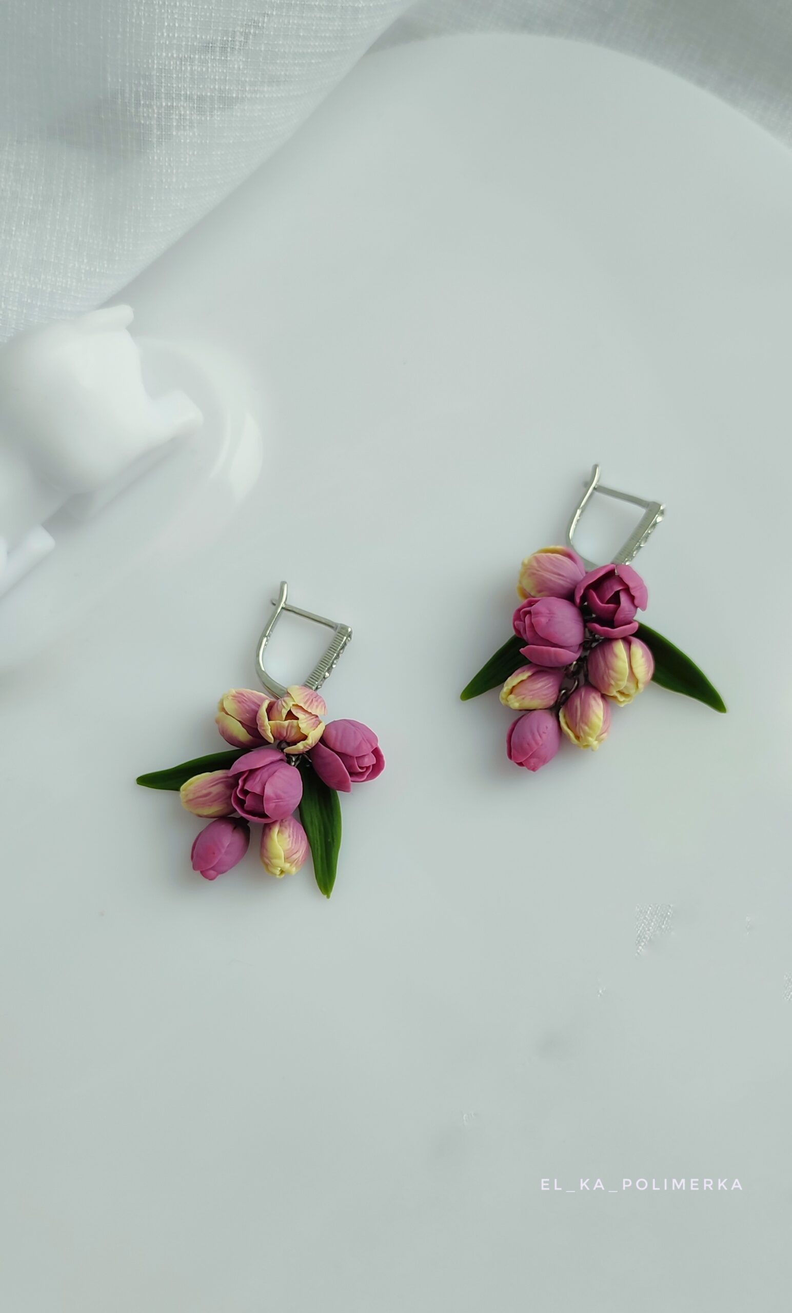 Серьги — изящные подвески в виде букетиков тюльпанов. Цветы выполнены из полимерной глины с невероятной детализацией — каждый лепесток и листик проработан вручную.