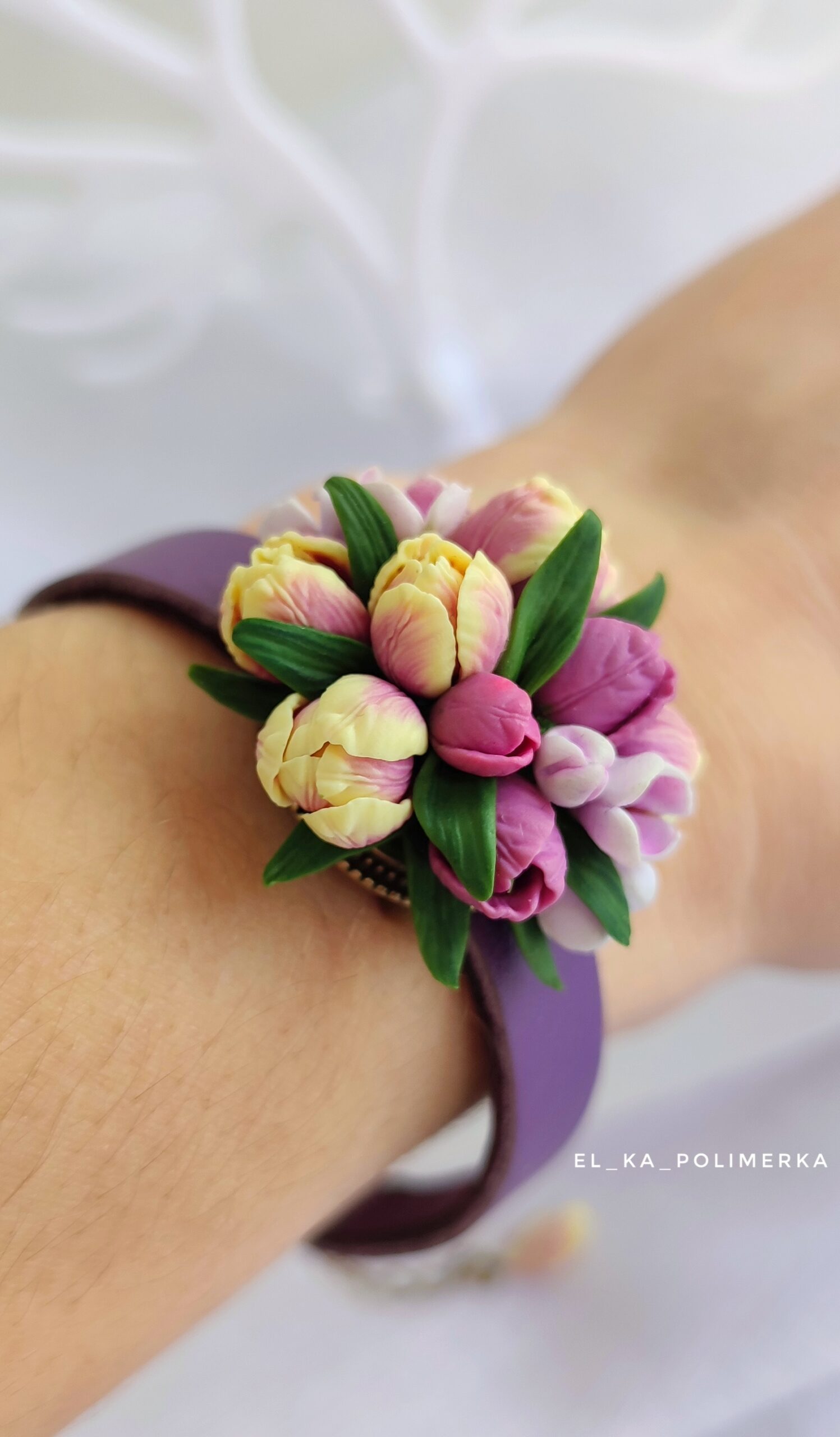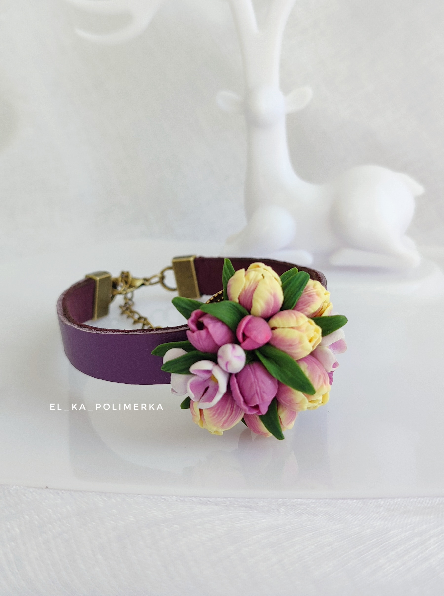Сочетание изысканной натуральной кожи и нежных тюльпанов из полимерной глины создаёт неповторимый образ, который подойдёт как для повседневного стиля, так и для особых случаев.