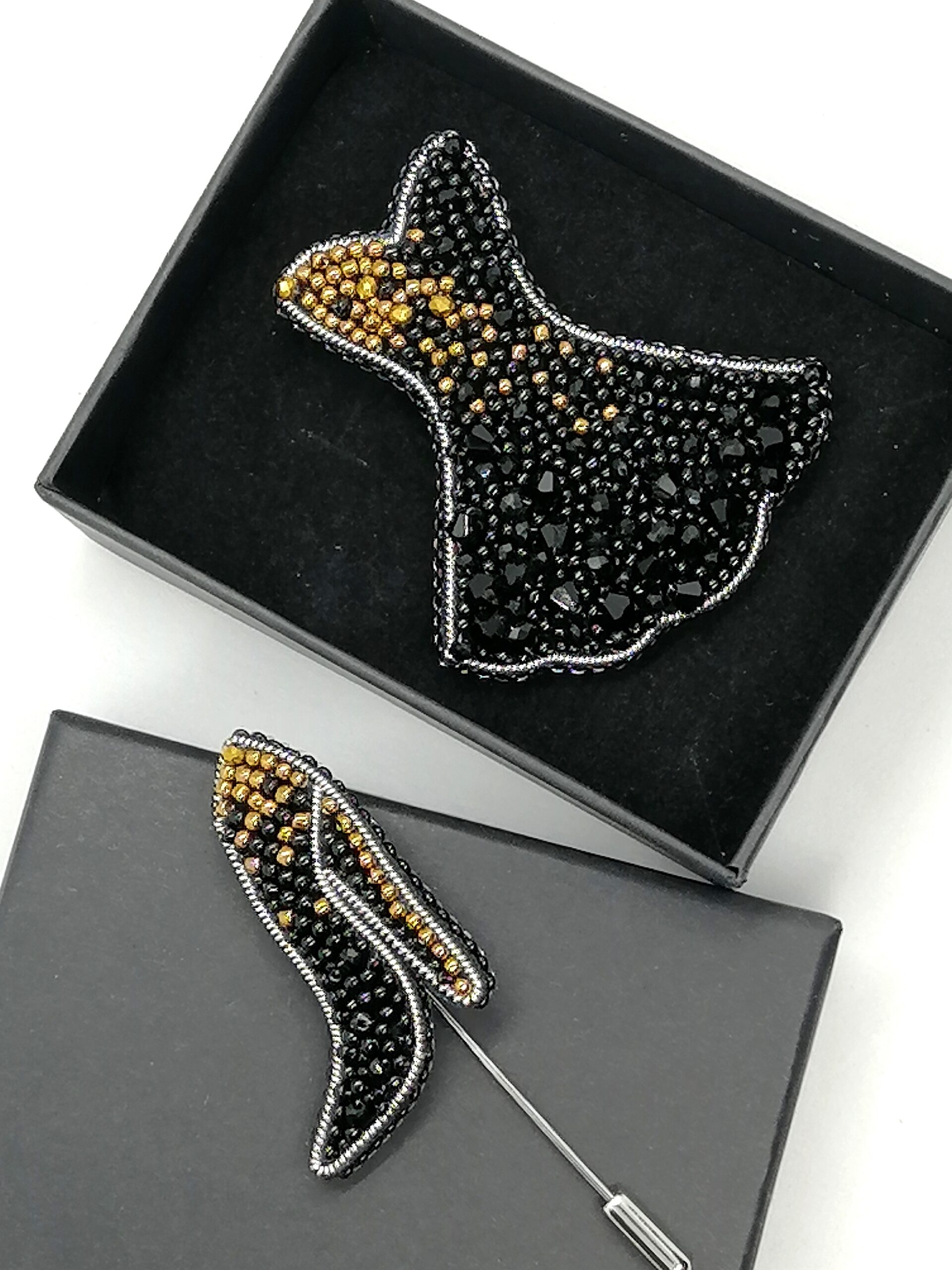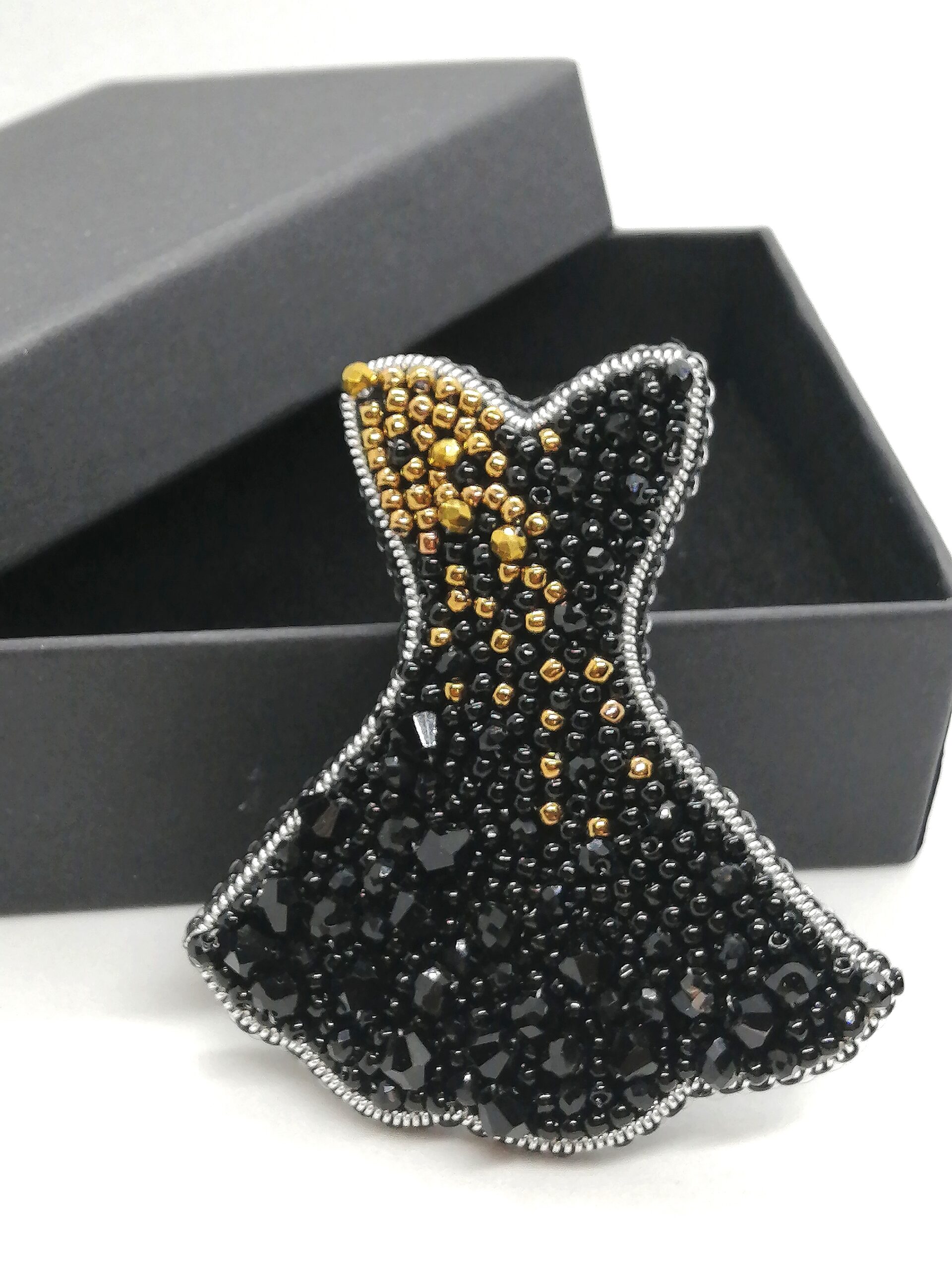 Для поклонниц таланта Коко Шанель создан этот комплект брошей — маленькое черное платье и туфелька.